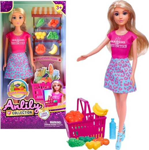 Ta očarljiva punčka v čudovitih oblačilih je pripravljena na nakupe na barviti stojnici s sadjem in zelenjavo. Otroci lahko kupujejo, razvrščajo in prenašajo živila v prostorni košari, pri čemer si naravno osvajajo osnovna načela zdravega prehranjevanja.