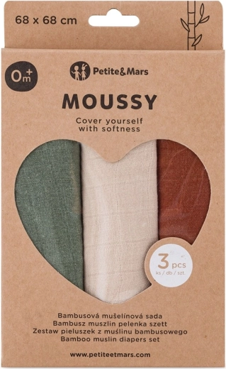 Bambusovo-bombažne muslinaste pleničke Moussy so nepogrešljiv del vsakodnevne nege dojenčka. Zaradi kombinacije 70 % bambusa in 30 % bombaža izstopajo po mehkobi, lahkotnosti in odlični vpojnosti. Varne so že od rojstva, ne vsebujejo škodljivih snovi in so prijazne tudi do najbolj občutljive kože.