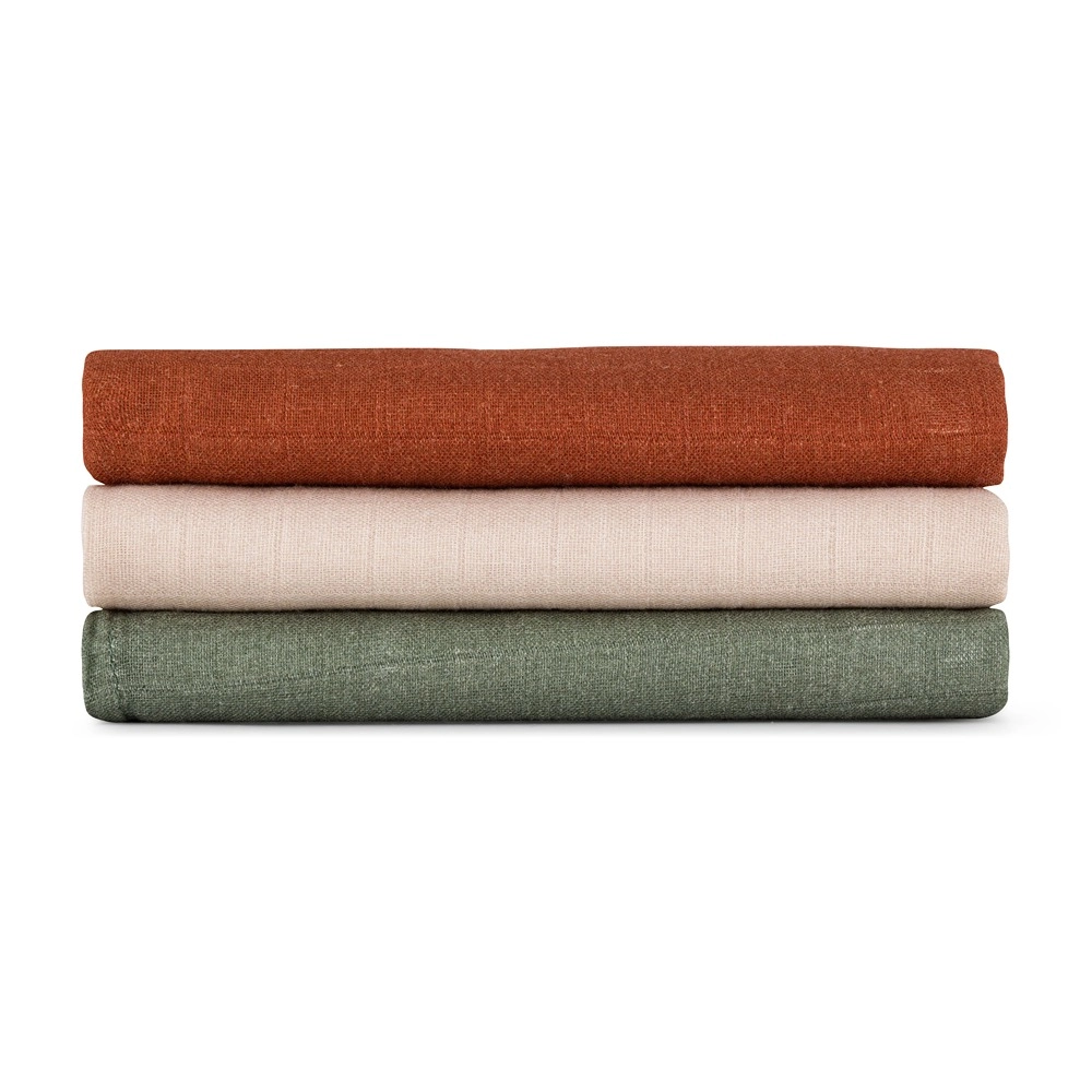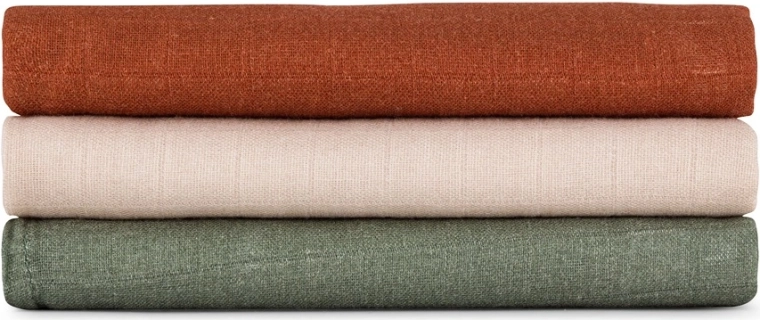 Vsestransko uporabo boste cenili doma in na poti: kot pleničko, brisačko, odejico, povijalno pleničko ali pleničko za podiranje kupčka. Muslin je zračen, odporen na vonjave in zaradi termoregulacije poleti prijetno hladi, pozimi pa greje. Elegantne Earth Tones odtenke zlahka uskladite z otroško opremo.