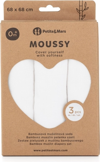 Komplet PETITE&MARS Moussy Total White prinaša trojico puhastih muslinastih pleničk iz 70 % bambusa in 30 % bombaža. Zaradi nežne, zračne vezave so prijazne tudi do najbolj občutljive kože novorojenčkov in odlično vpijajo. Uporabne doma in na poti – kot robček, ljubkovalna brisačka, podloga, slinček ali plenička za podrignjenje.