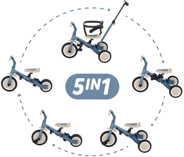 Rastoči tricikel za otroke 1,5–5 let, ki se zlahka spremeni iz vozička z asistenco staršev v samostojno kolo s pedali. Zahvaljujoč 5 načinom, nastavljivemu krmilu, nastavljivemu sedežu z varnostnimi pasovi in vzdržljivim gumijastim kolesom varno pomaga razvijati ravnotežje in koordinacijo. Brez orodja spremenite konfiguracijo v hipu, lahka konstrukcija 5,6 kg je idealna za doma in na prostem.