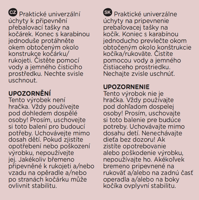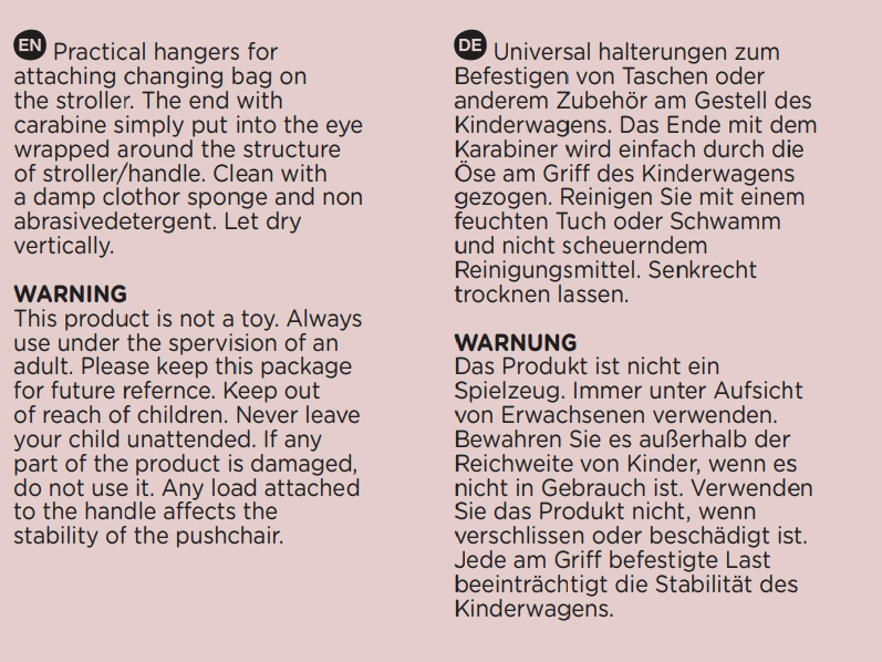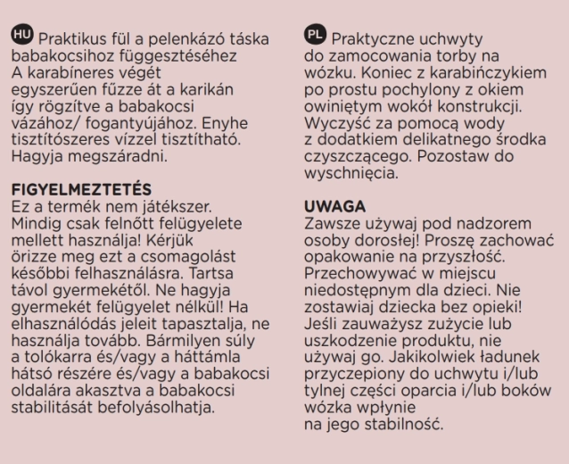 - Ne preobremenjujte ročaja vozička; obešeno breme lahko vpliva na stabilnost. Izdelek ni igrača. Uporabljajte pod nadzorom odrasle osebe. V primeru obrabe ali poškodbe ne uporabljajte.