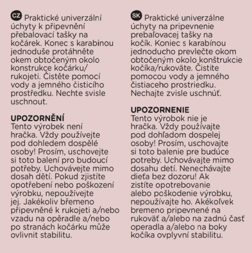 Rešitev je idealna za previjalne torbe, torbice in manjše nakupe. Prožen pašček se zlahka ovije okoli konstrukcije, zapne in je pripravljen za uporabo. Vzdrževanje je preprosto – zadostujeta voda in blag čistilni pripravek.