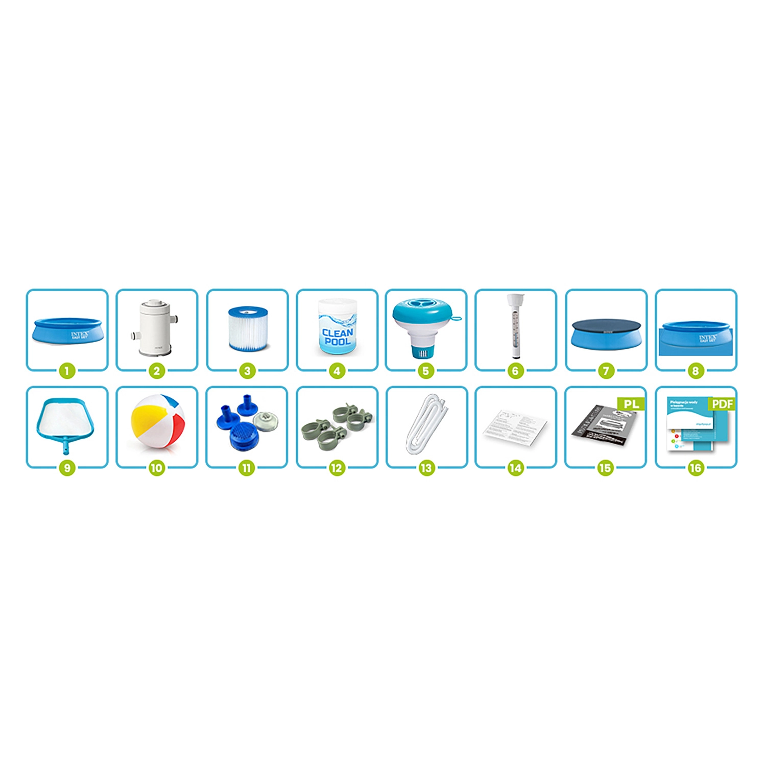 V paketu dobite vse: bazen, kartušno črpalko s filtrom H, multitablete, dozirnik s termometrom, pokrivalo, podlogo, mrežico, cevi, objemke, sesalne košare, navodila, popravljalni obliž in tudi plaž žogo. Preprost začetek brez dodatnih nakupov.