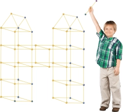 Odkrijte čar kreativne gradnje z našim čudovitim gradbenim kompletom, ki otrokom omogoča gradnjo različnih struktur, kot so šotori, baze ali celo pasje utice! Komplet vsebuje 75 delov, vključno s 51 rumenimi palicami in 24 raznobarvnimi povezovalnimi kroglicami, ki ponujajo neskončne možnosti gradnje.
