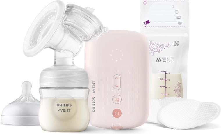 Električna prsna črpalka PHILIPS AVENT s tehnologijo Natural Motion združuje nežno stimulacijo in učinkovito črpanje za hiter pretok mleka brez potrebe po sklanjanju. Ponuja 8 stopenj stimulacije in 16 stopenj črpanja, tih motor za diskretno uporabo ter pomnilnik zadnje nastavitve. Mehki prilagodljivi silikonski nastavek udobno sede do velikosti bradavice 30 mm, manjše število delov pa pomeni enostavno čiščenje in hitro sestavljanje.