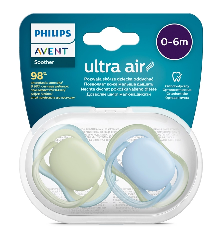 Philips Avent Ultra Air je zasnovana za nežno pomirjanje in bolj zdravo kožo dojenčka. Ekstra velike odprtine v ščitniku zagotavljajo višjo cirkulacijo zraka, zaradi česar koža okoli ust ostane sušja in manj razdražena. Lahka zasnova in ergonomski obroč olajšata rokovanje in pritrjevanje.