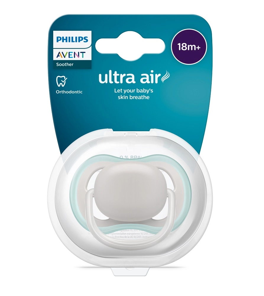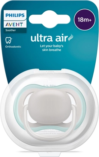 Philips Avent Ultra Air je duda, zasnovana za udobje in zdrav razvoj. Velike zračne odprtine zagotavljajo boljše kroženje zraka in pomagajo ohranjati občutljivo otroško kožo bolj suho. Mehak, teksturiran in izjemno trpežen silikonski cucelj spoštuje naravno obliko neba, zob in dlesni, zato je idealen tudi v obdobju izraščanja zobkov.