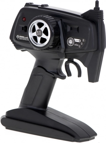Priložen je oddajnik 2,4 GHz za stabilno in nemoteno upravljanje. Model napaja akumulator, upravljalnik potrebuje 4× AA 1,5 V. Mere 48 × 27 × 25 cm ponujajo idealno razmerje med okretnostjo in prehodnostjo terena.