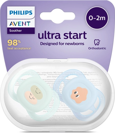 Dudica Philips Avent Ultrastart je zasnovana posebej za najmlajše. Izjemno lahka oblika z majhnim ščitkom upošteva nežno kožo in proporce novorojenčkov 0–2 meseca. Mehak silikonski cucek za stik z živili podpira naravno sesanje in je prijeten za dlesni. Zračne odprtine v ščitku izboljšajo kroženje zraka in zmanjšujejo tveganje za draženje kože.