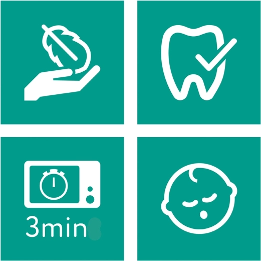 Priloženo je praktično ohišje, ki služi za higiensko shranjevanje in hitro sterilizacijo v mikrovalovni pečici. Tako bodo dudice čiste in pripravljene za uporabo kjerkoli – doma ali na poti. Starši cenijo tudi visoko stopnjo sprejetja (98 %), ki pomaga hitro potolažiti in pomiriti dojenčka.