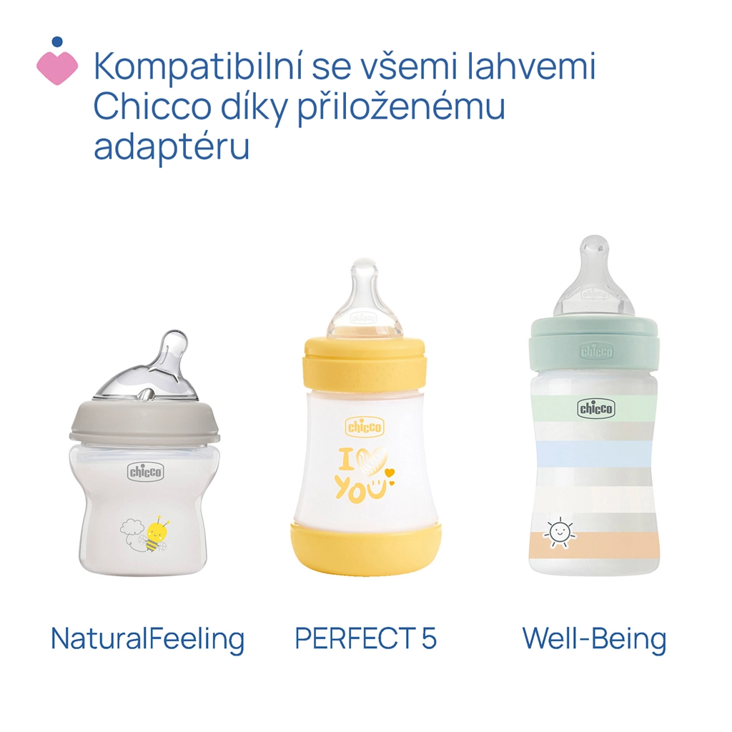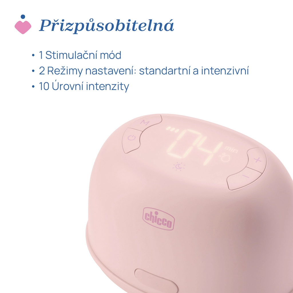 Z zahvaljujoč preglednemu digitalnemu zaslonu in intuitivnim gumbom zlahka izberete 1 stimulacijski način in 2 načina črpanja z do 10 stopnjami nastavitve za vsak način. Vrtljivi rožnati deli na nastavku (do 180°) pomagajo k popolnemu izpraznjenju dojk. Praktično USB‑C polnjenje, prijetna nočna osvetlitev in kompatibilnost s stekleničkami Chicco NaturalFeeling in Well‑Being jo naredijo odličnega pomočnika doma in na poti.