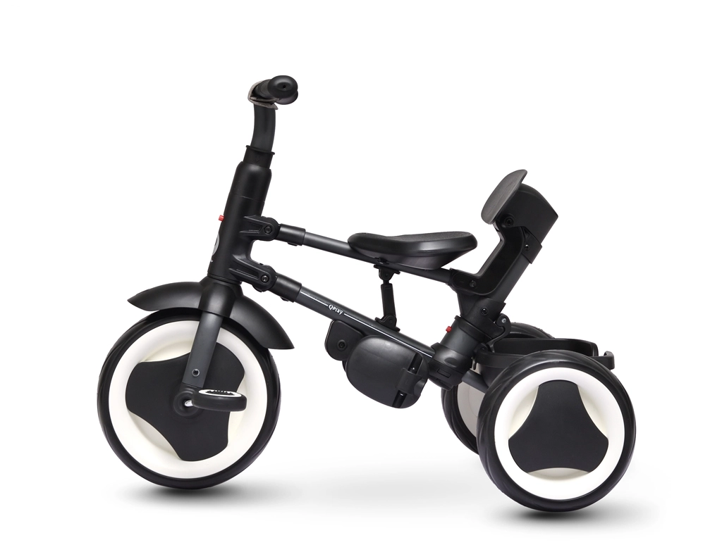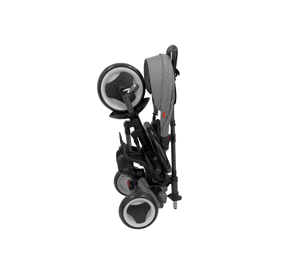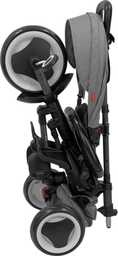 Za varnost skrbijo 5-točkovni pasovi, odstranljiv varnostni lok in zavore na zadnjih kolesih. Antivibracijska EVA kolesca blažijo neravnine in ne zahtevajo vzdrževanja. Zložljivost in hitra uporaba sta samoumevni: tricikel zložite brez orodja v 3 klikih in ga zahvaljujoč pametni zasnovi po zložitvi udobno premikate kot potovalno torbo.