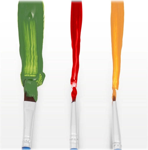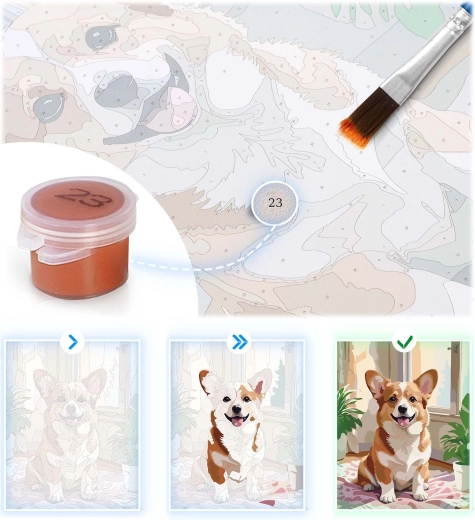 Celovit komplet s predtiskaným platnom na okvirju, 30 prekrivnimi barvami in 3 čopiči različnih velikosti – samo odprite in začnite slikati.