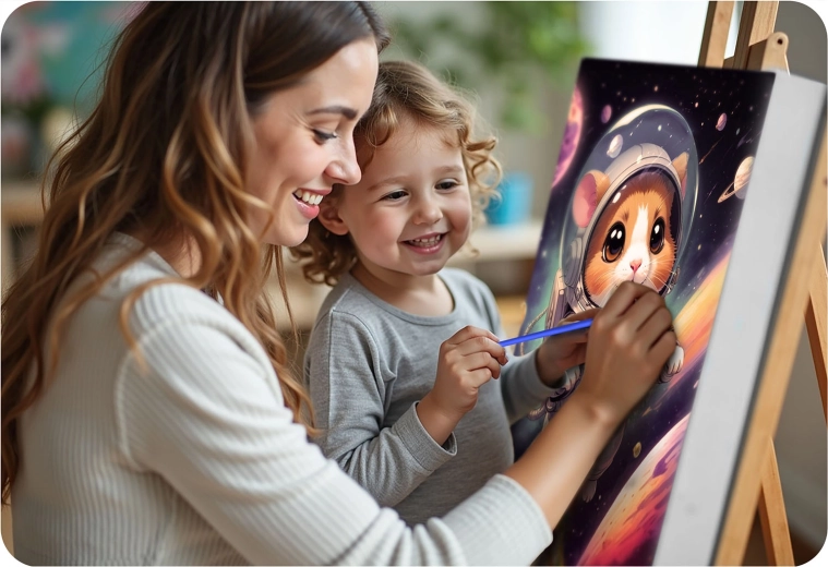- Kreativna zabava za male in velike: skupno slikanje krepi potrpežljivost, osredotočenost in veselje do ustvarjanja.