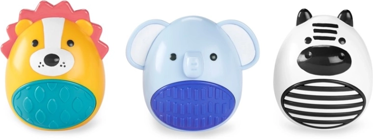 Komplet ropotuljic Skip Hop Jungle Beats prinaša zabavo in razvoj fine motorike. Zebra, slon in lev oddajajo različne zvočne učinke, zato otroka spodbujajo k preizkušanju in stresanju. Zahvaljujoč ergonomskim oblikam jih zlahka primejo tudi najmanjše ročice, teksturirani trebuščki pa spodbujajo tipno zaznavanje.