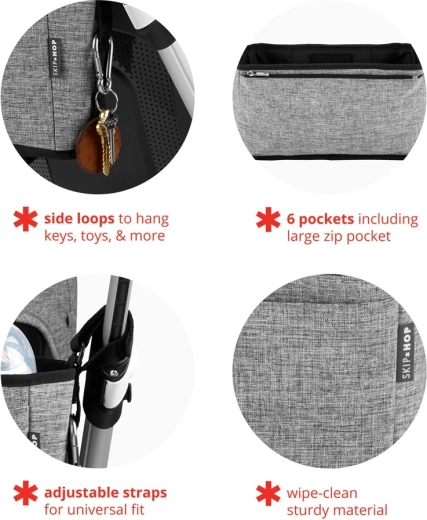 Praktičen organizator za voziček Skip Hop Grab & Go Ultra v modnem sivem melange videzu ponuja šest žepov, velik žep na zadrgo in stranske zanke za ključe ali igrače. Zahvaljujoč nastavljivim trakom ga zlahka pritrdite na večino vozičkov, trpežen in enostavno čistljiv material pa poskrbi, da je vse varno in na dosegu roke.