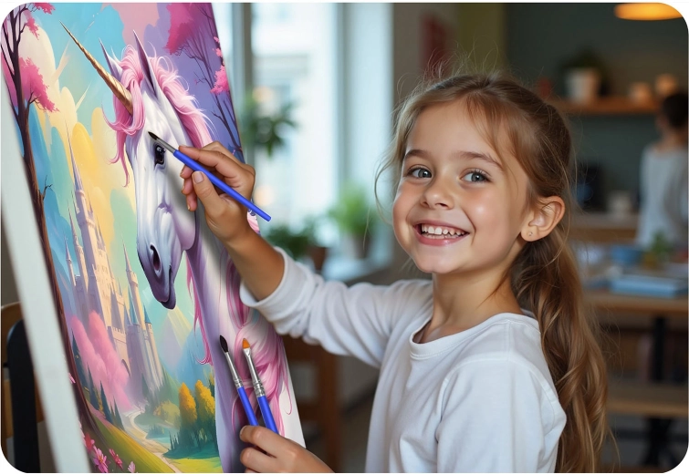 Komplet je primeren za otroke in odrasle ter je odličen za skupno ustvarjanje celotne družine. Kakovostno platno napeto na lesenem okvirju, intenzivne akrilne barve in trije natančni čopiči zagotovijo čiste linije in fine detajle. Po končanem delu sliko preprosto obesite s priloženo opremo.