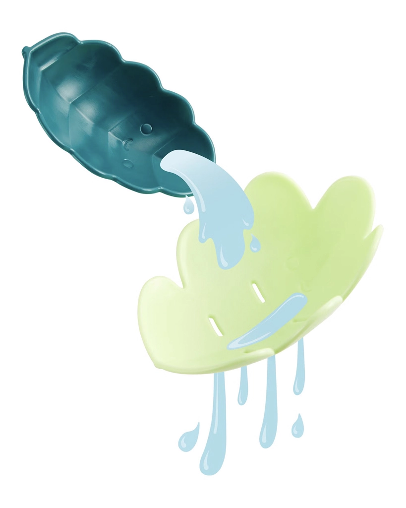 Listnata cedila z odprtinami omogočajo prelivanje in cejenje. Otroci opazujejo tok vode ter se učijo vzroka in posledice pri varni senzorični igri.