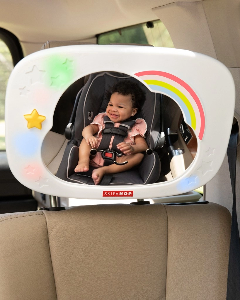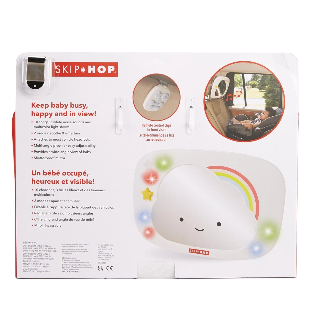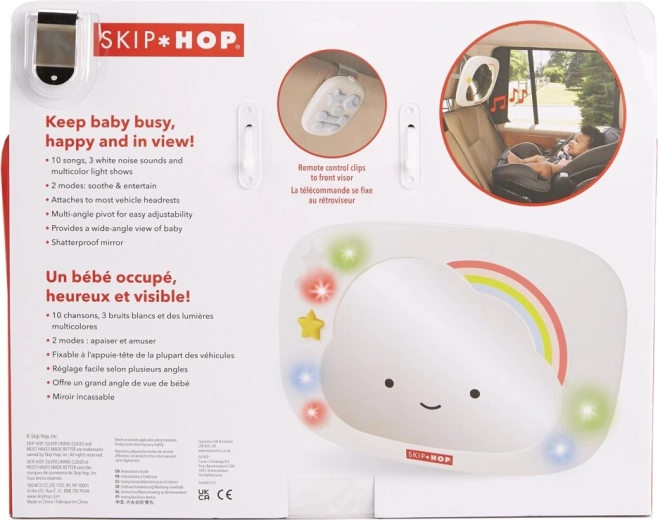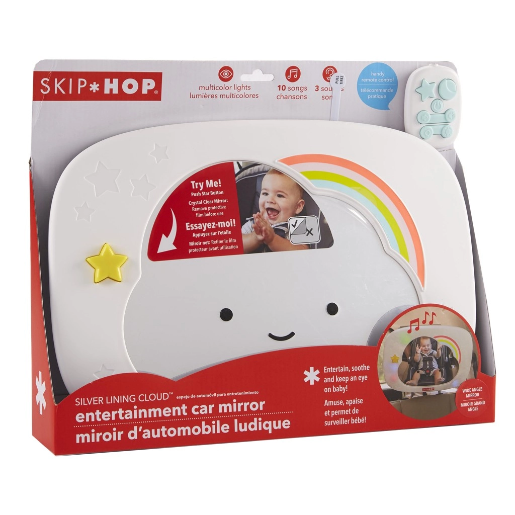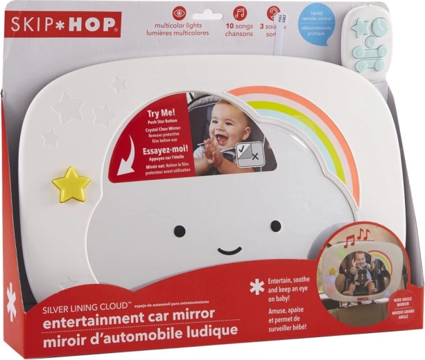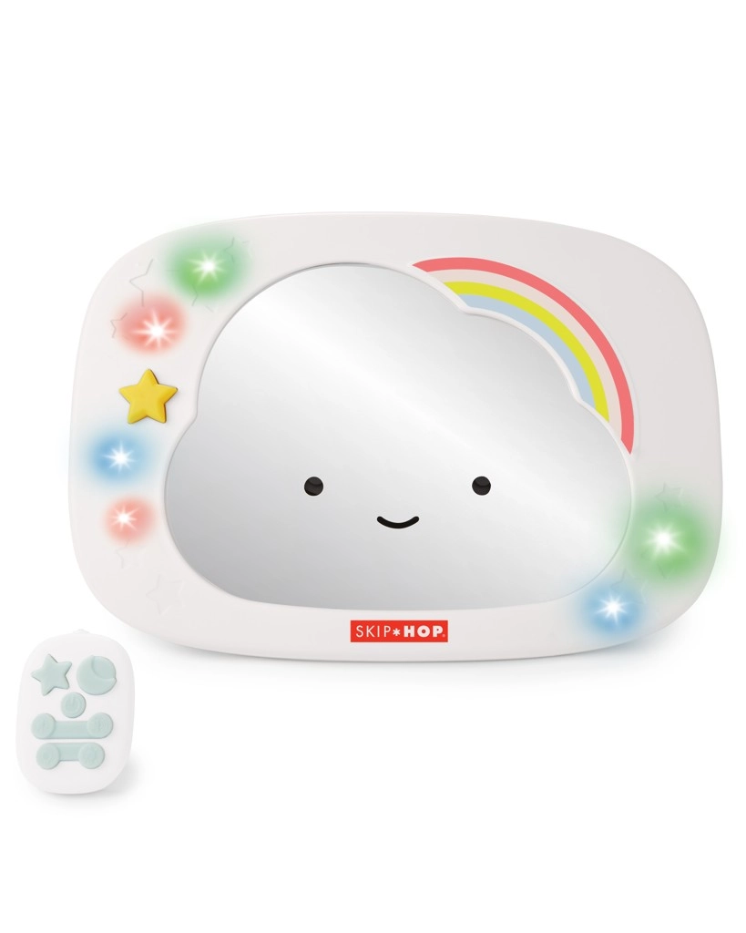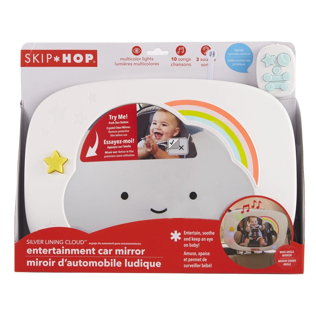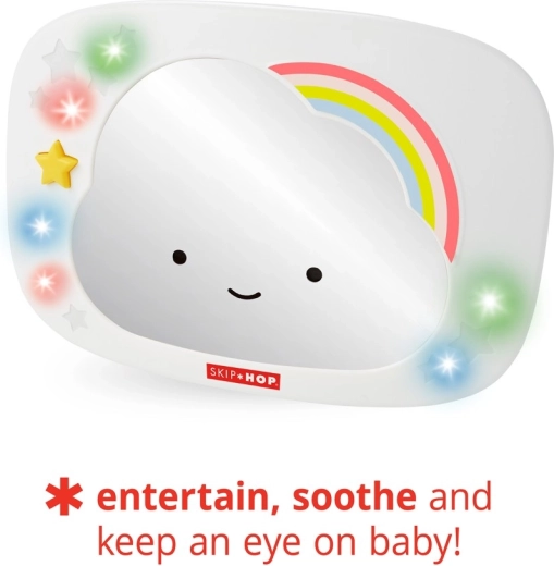 Prisrčno ogledalo za avtosedež v obliki oblačka znamke SKIP HOP pomaga staršem imeti pregled nad dojenčkom ter ga hkrati zabavati in pomiriti. Ponuja večbarvne LED luči, glasbo in beli šum, daljinsko upravljanje s sponko ter širok kot zajema zahvaljujoč veliki, ukrivljeni površini ogledala in večkotnemu zglobu.
