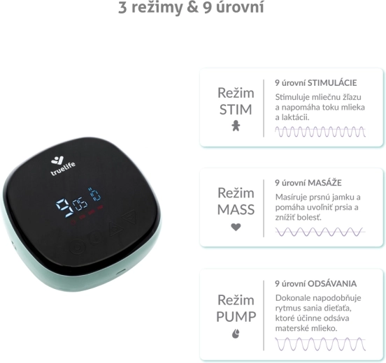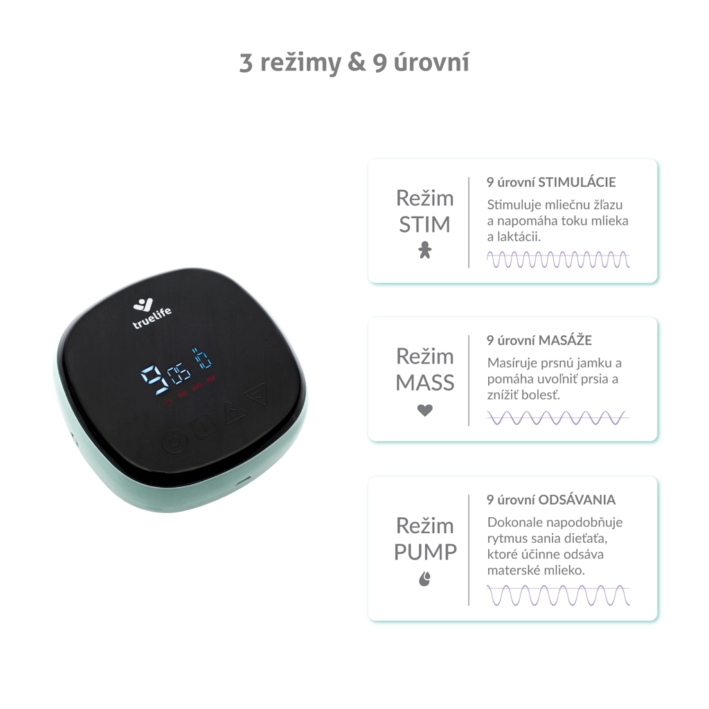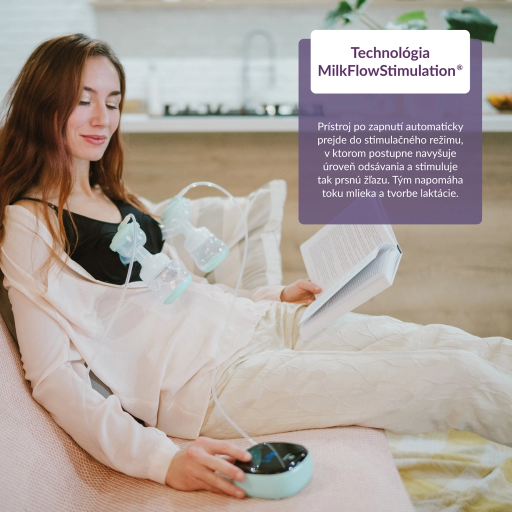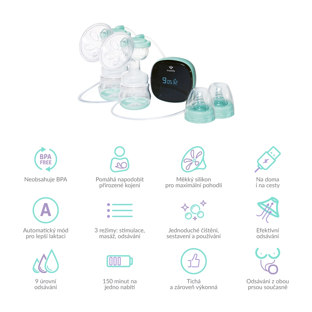 TrueLife Nutrio BP je zanesljiva električna dvojna prsna črpalka, zasnovana za mamice, ki želijo prihraniti čas in povečati udobje. Sočasno črpanje iz obeh dojk podpira laktacijo, prihrani čas in omogoča, da imate mleko pripravljeno za kasneje – v hladilniku zdrži do 48 ur. Tehnologija MilkFlowStimulation® pomaga pri nežni stimulaciji pretoka mleka in je primerna tudi pri težavah z dojenjem.