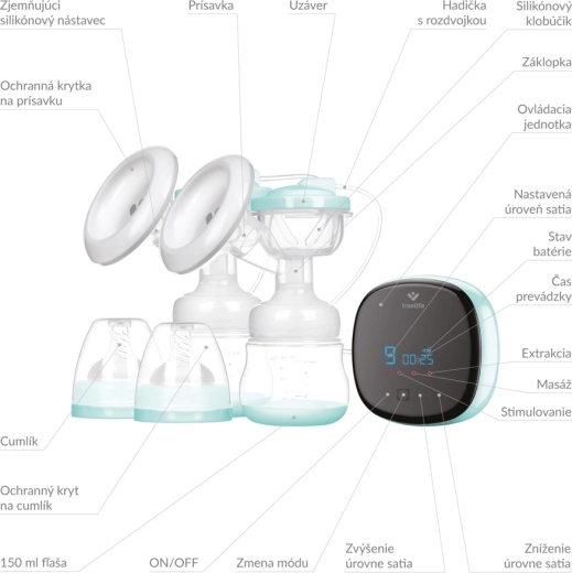 Upravljanje je preprosto zahvaljujoč LED-zaslonu z na dotik občutljivimi tipkami in praktičnemu časovniku. Izberite med 3 načini – stimulacija, masaža in črpanje – ter med 9 stopnjami intenzivnosti za maksimalno udobje. Lahka zasnova, kompaktne mere in baterija z avtonomijo do 150 minut naredijo to črpalko idealnega pomočnika doma in na poti. Mehki silikonski nastavki s prožnim robom ter materiali brez BPA zagotavljajo varnost za vas in vašega malčka.