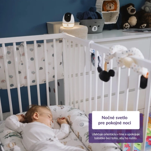 Kamero upravljate z enote za starše; omogoča 355° vodoravno in 105° navpično premikanje. Z nočnim vidom boste dojenčka jasno videli tudi v temi.