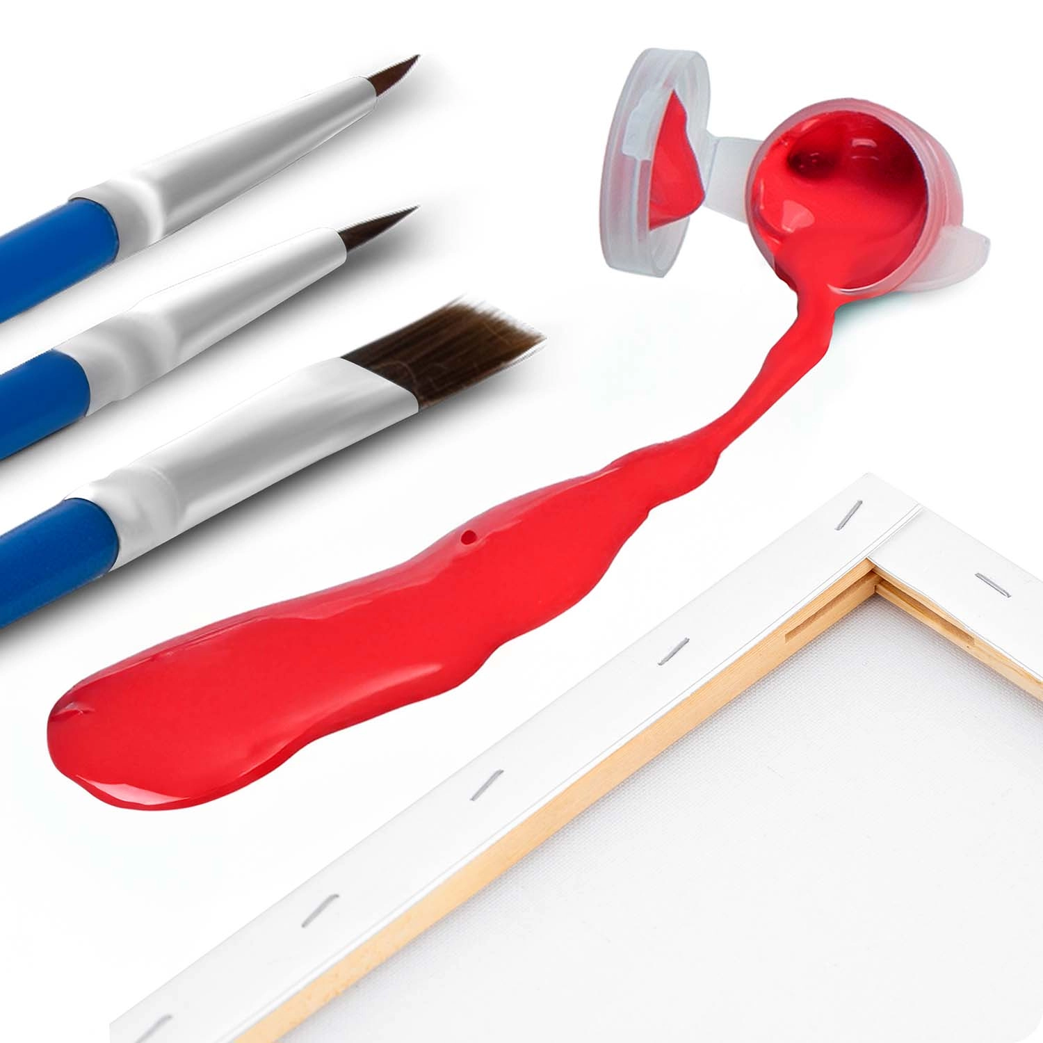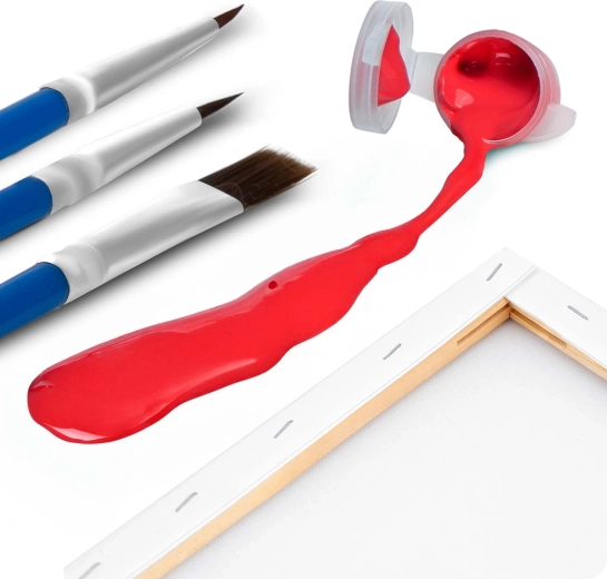 Kompleten komplet za takojšnje slikanje – pripravljeno platno na okvirju, do 30 intenzivnih akrilnih barv, 3 čopiči različnih velikosti in strojni material za obešanje.