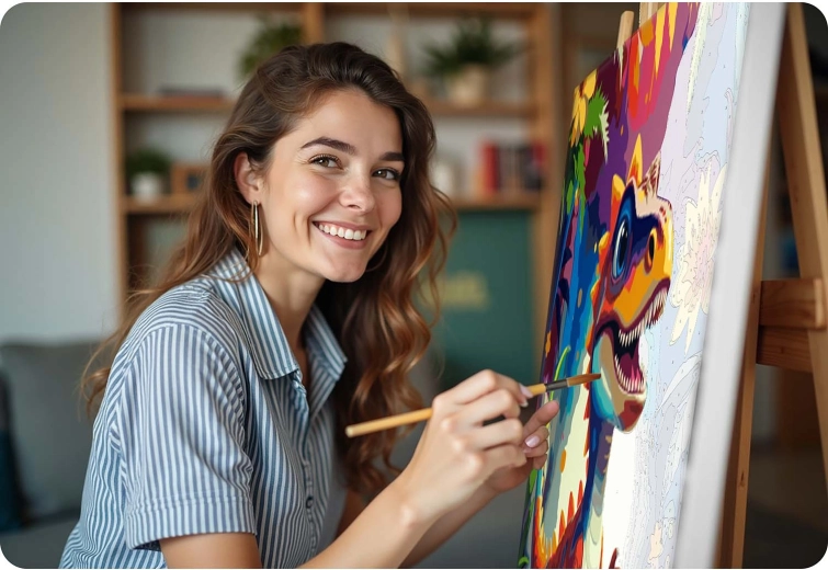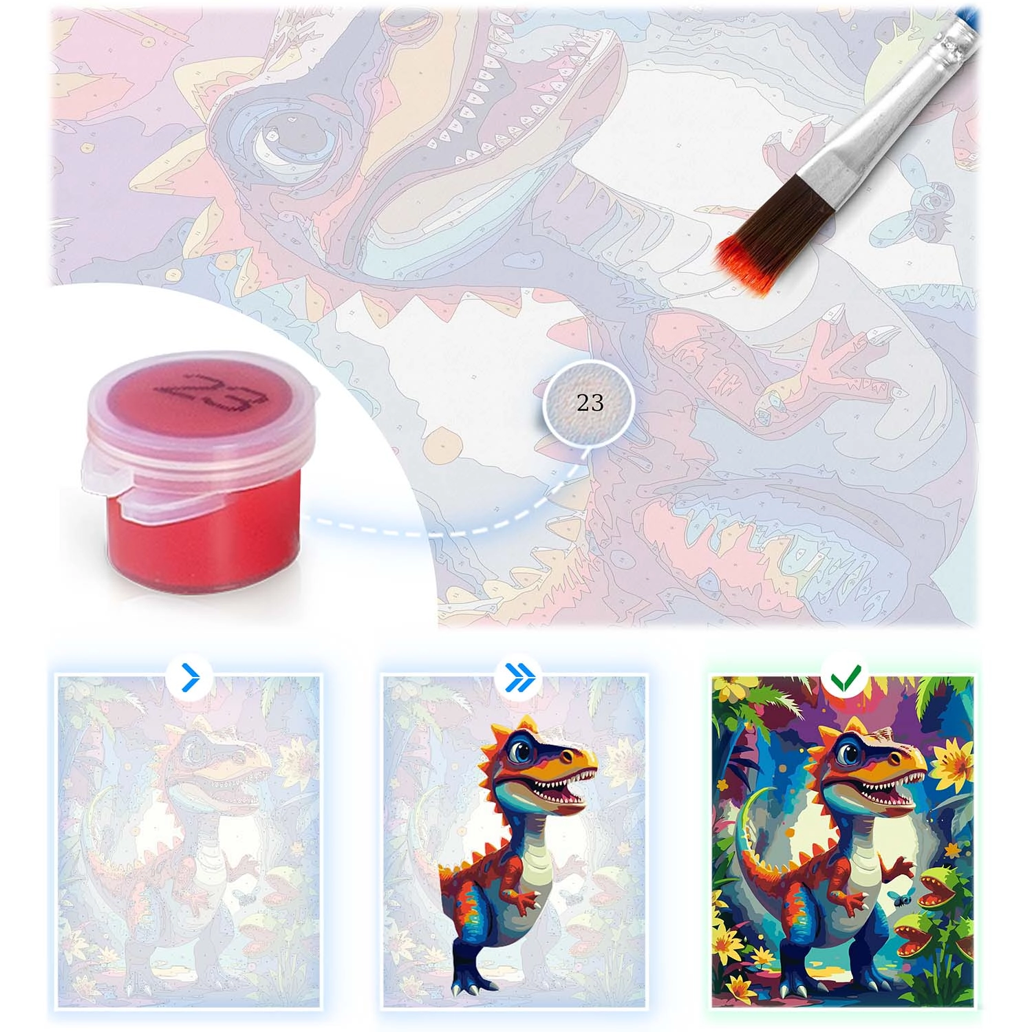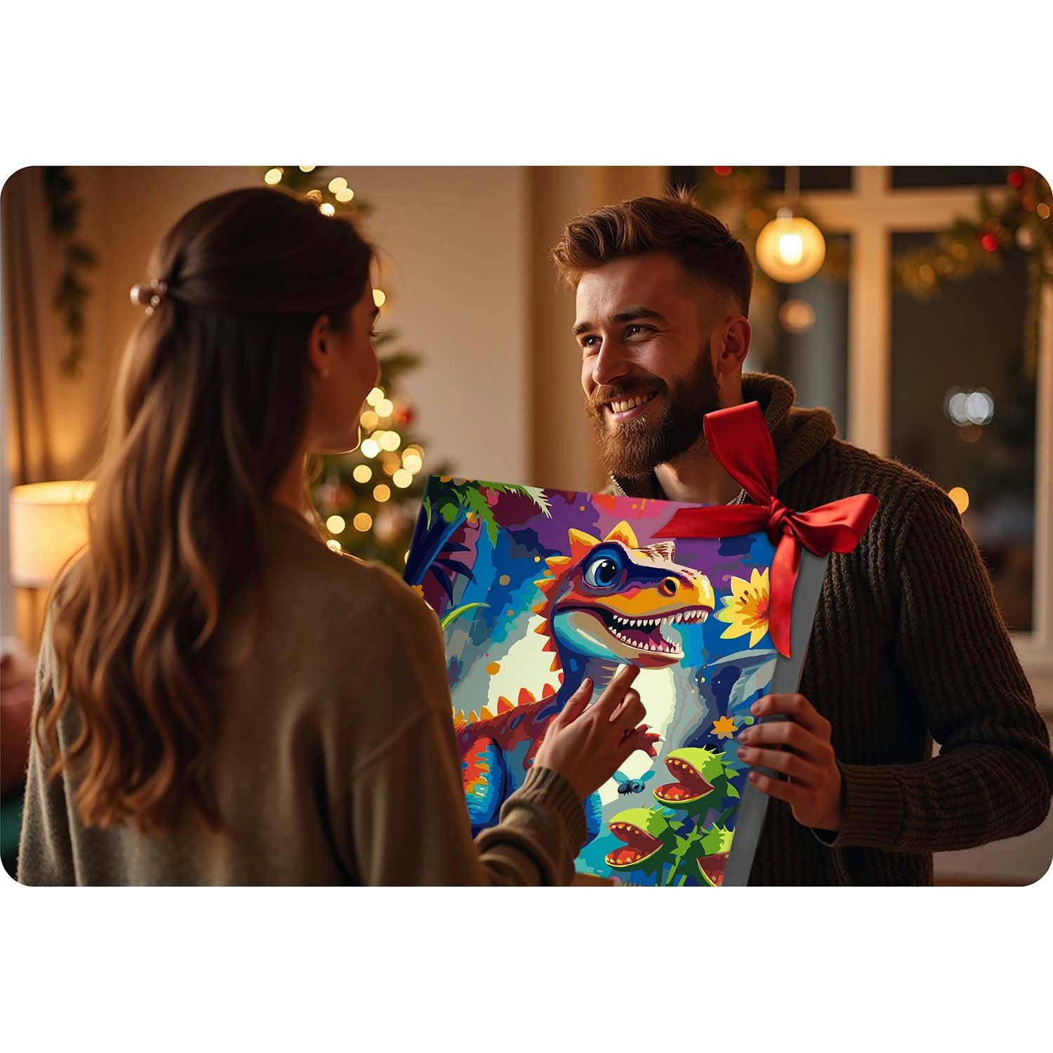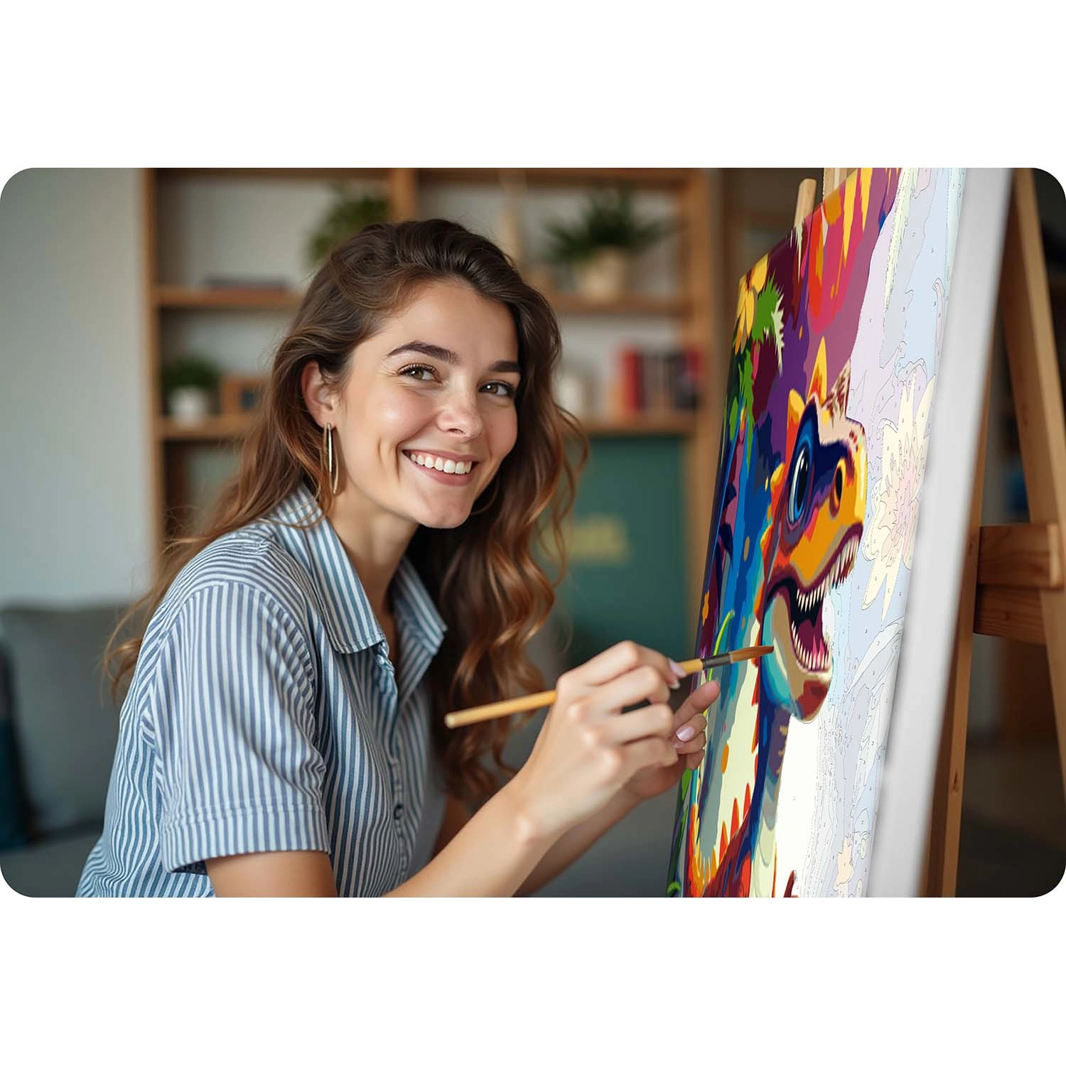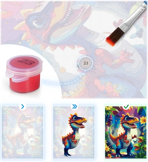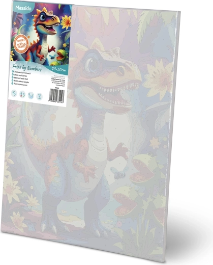 Odkrijte veselje do ustvarjanja s slikanjem po številkah 40 × 50 cm z motivom dinozavra. Set vsebuje vse potrebno: temeljito pripravljeno platno na okvirju, do 30 prekrivnih akrilnih barv, 3 čopiče različnih velikosti in kavljčke za obešanje. Zahvaljujoč barvni podslikavi z nežnimi linijami bo slikanje enostavno tudi za začetnike, rezultat pa bo imel intenzivne barve in polno prekrivnost brez prosevajočih črt.