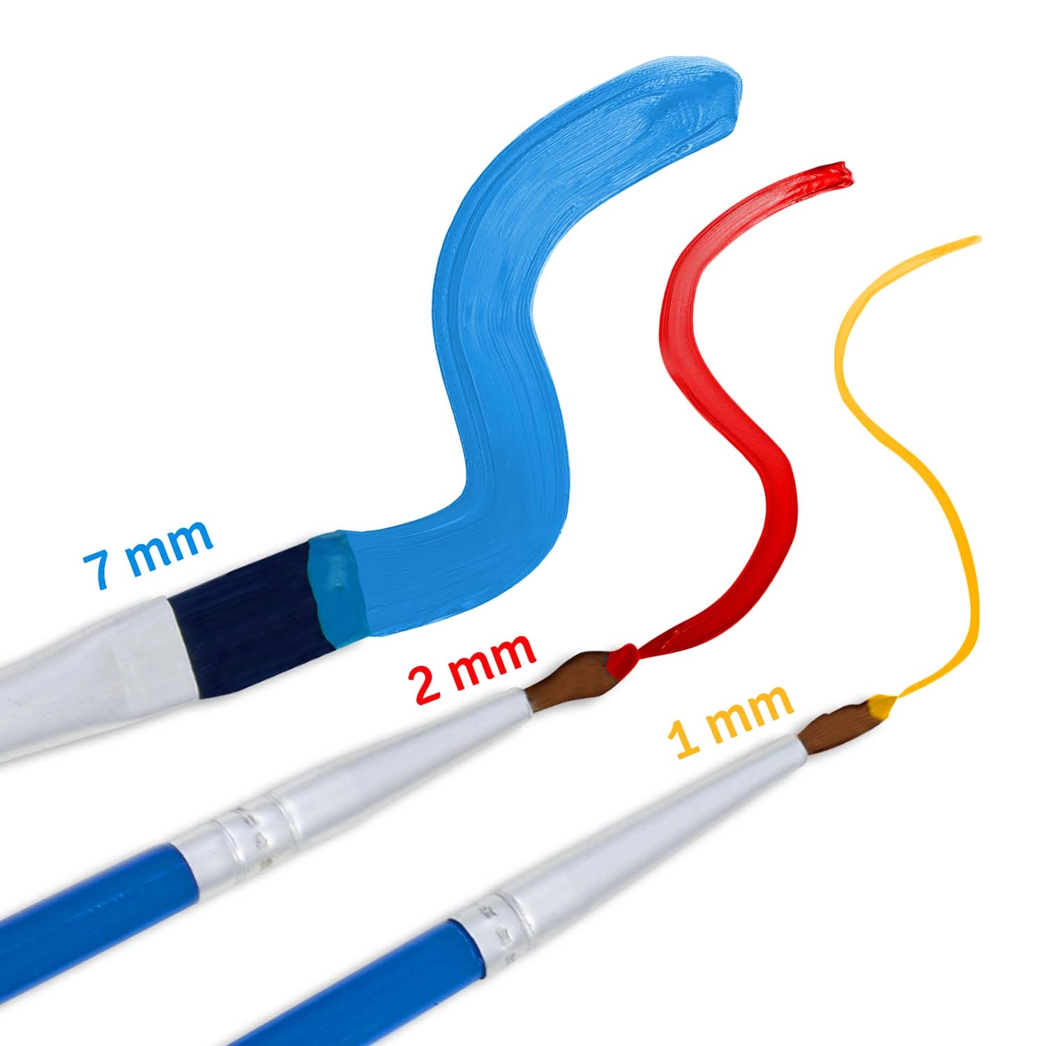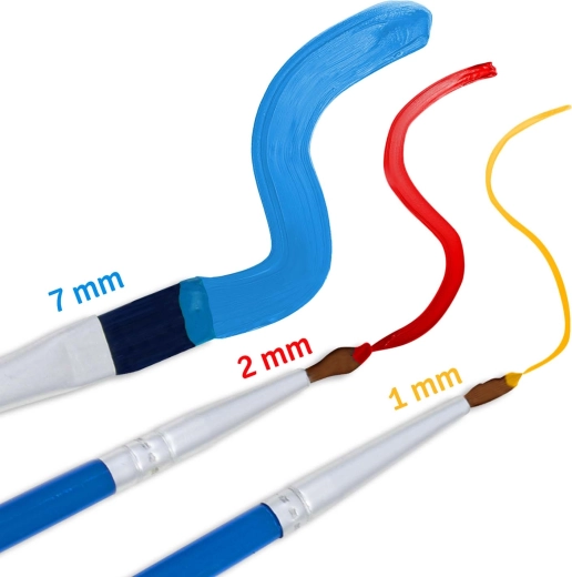 Trije čopiči (1 mm, 2 mm in 7 mm) pokrijejo velike površine in najmanjše detajle. Goste, prekrivne barve zagotavljajo polno prekrivnost brez prosevanja linij.