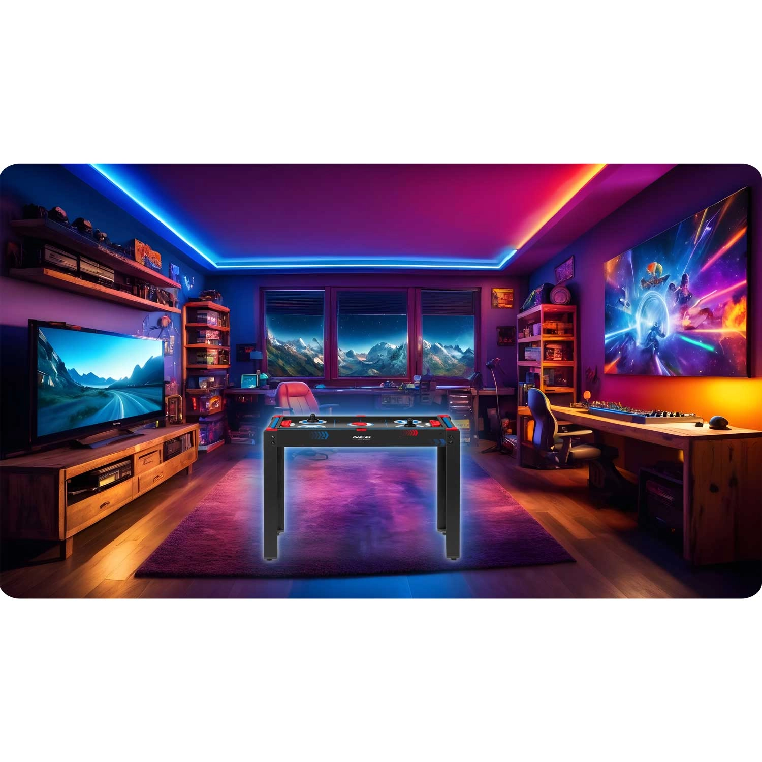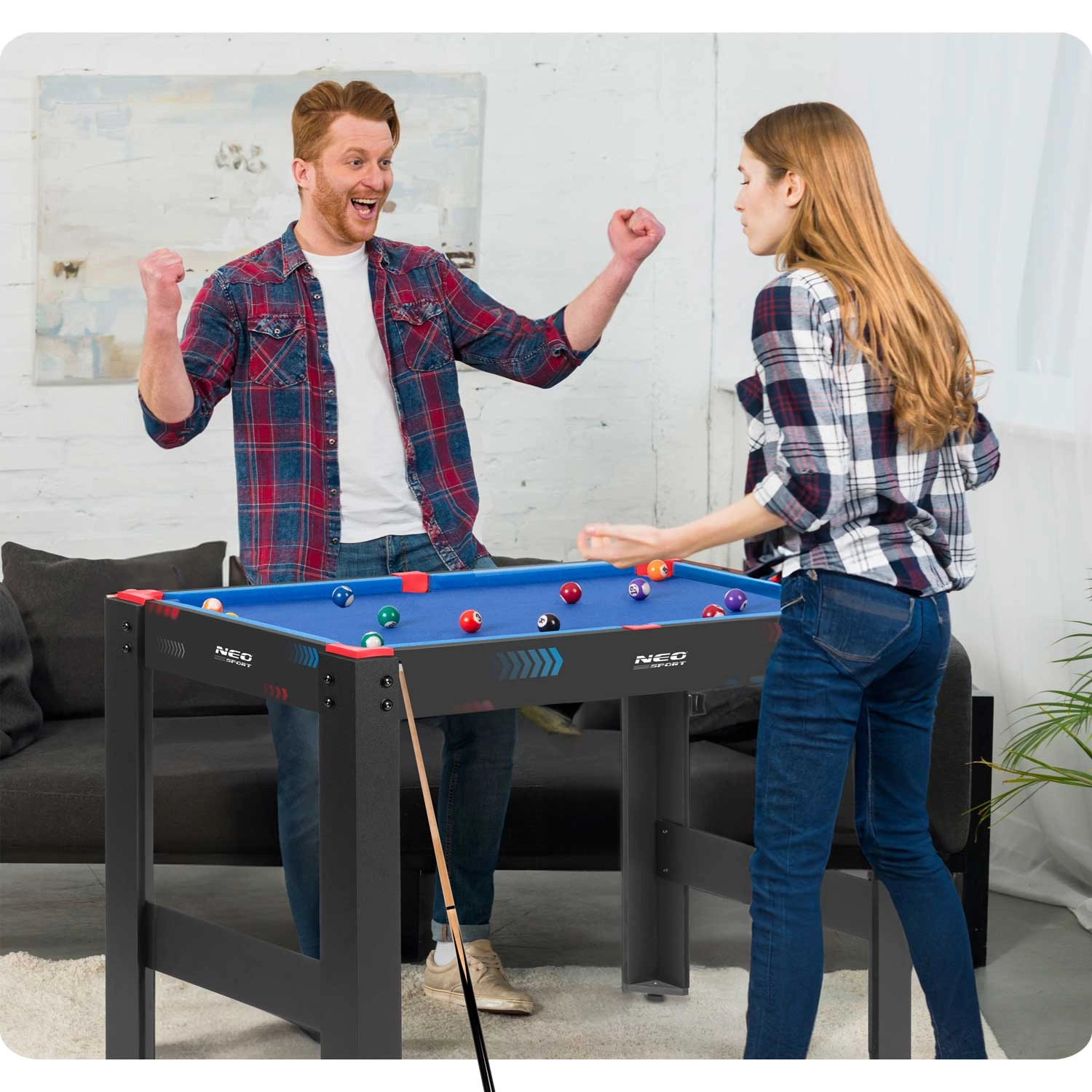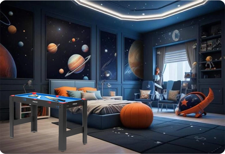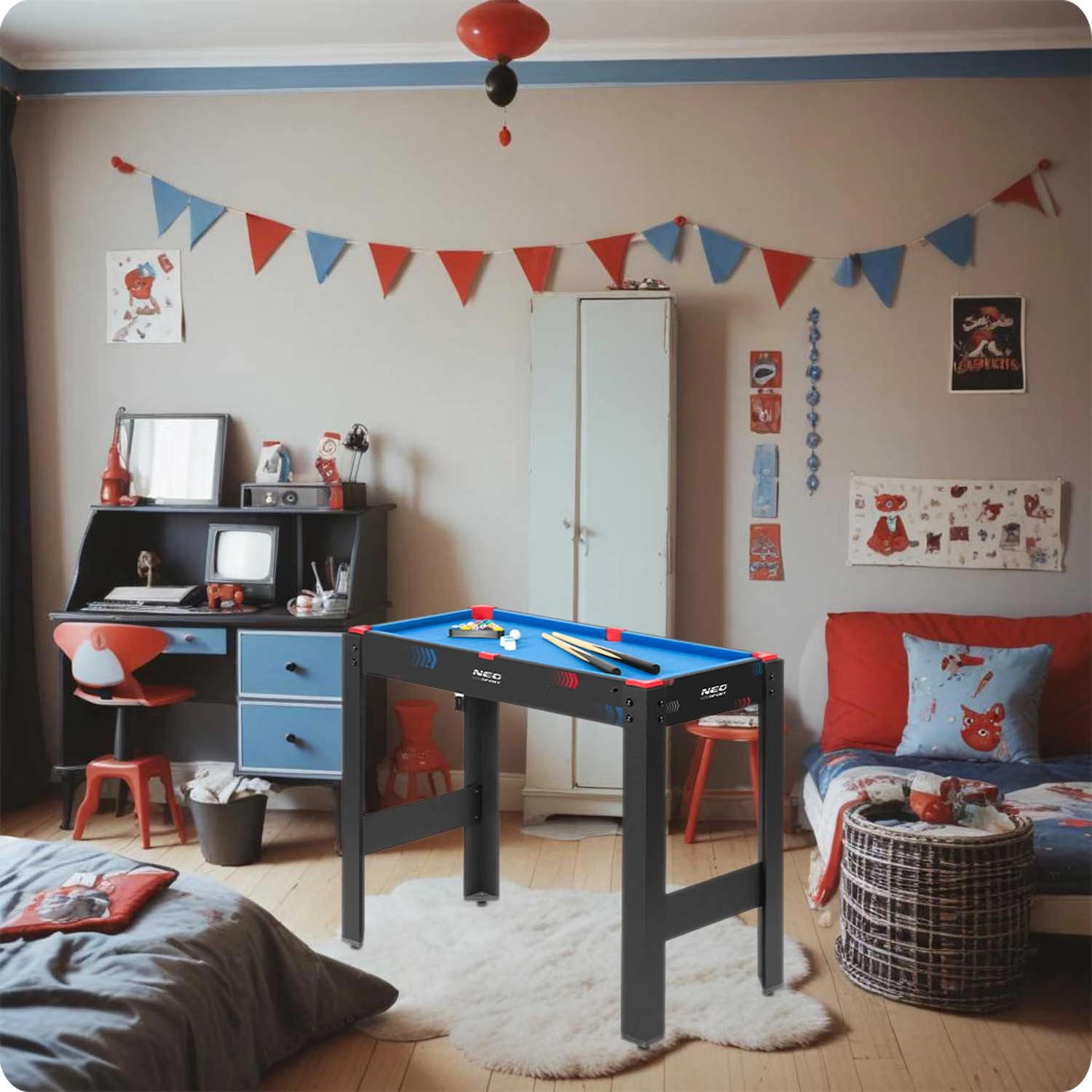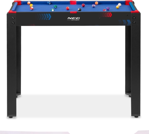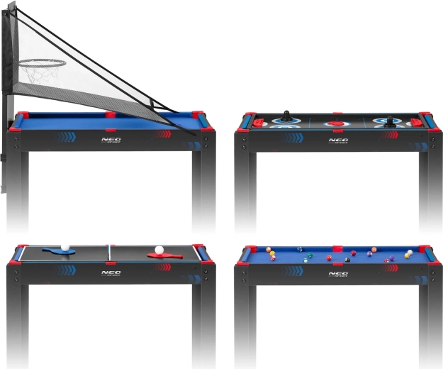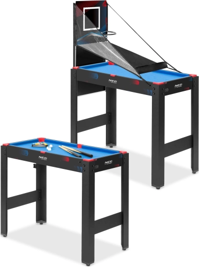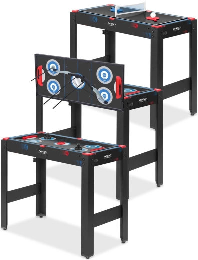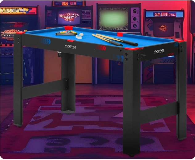 Igralna miza 5v1 NEO SPORT je idealna rešitev za otroško sobo, igralnico ali dnevno sobo. Zahvaljujoč trdni osnovi in premišljenim izmenljivim ploščam v hipu preklapljate med priljubljenimi igrami. Kompaktne mere prihranijo prostor – osnova z nogami, dvostranska plošča in biljardna miza se zložijo v eno celoto.