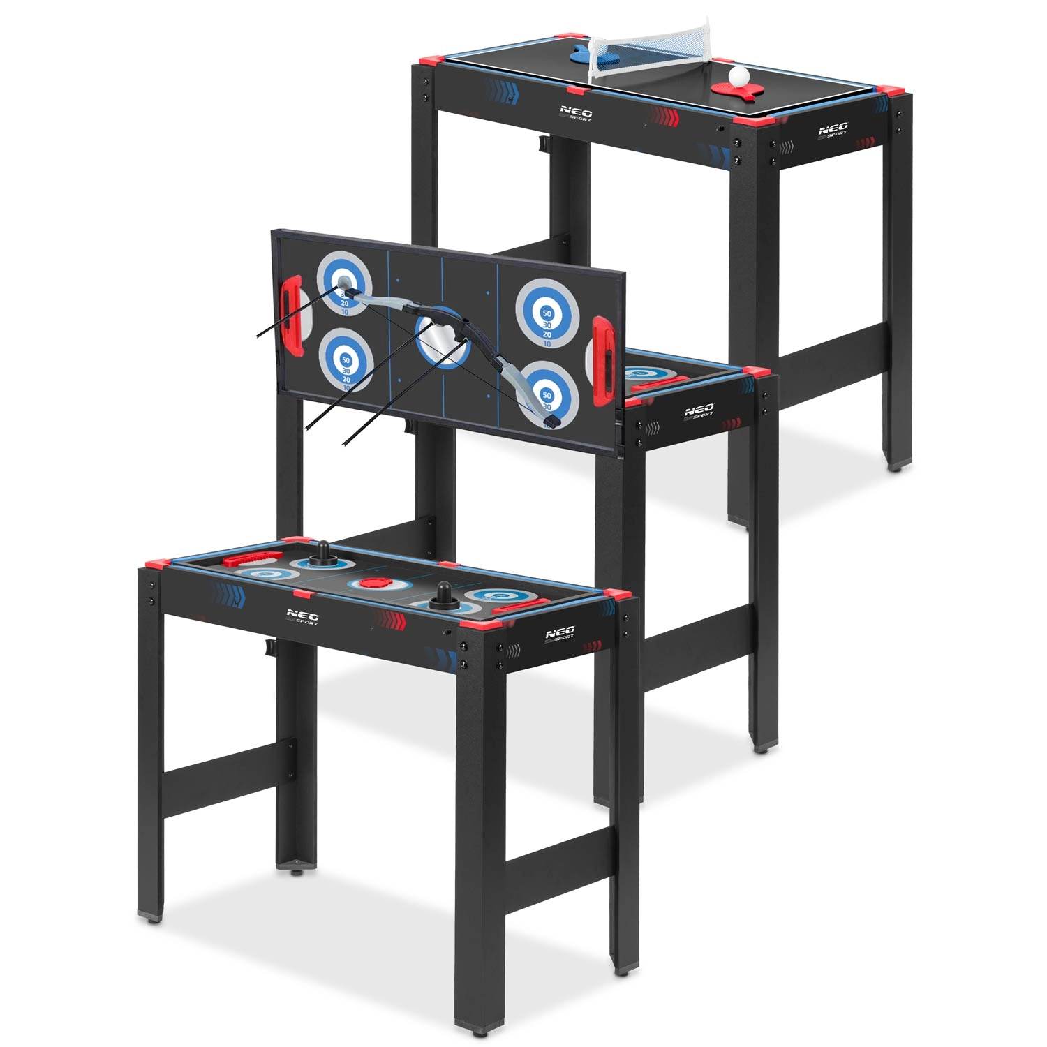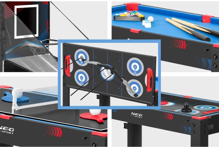 Menjajte med biljardom, zračnim hokejem, namiznim tenisom, košem s povratnim žlebom in lokostrelstvom v nekaj sekundah. Idealno za domačo zabavo in družinske turnirje.