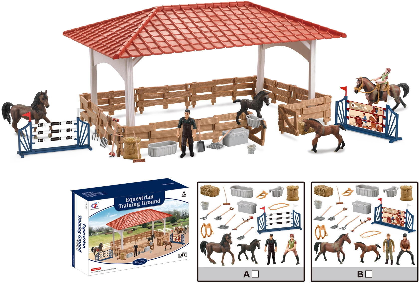 - Realistični dodatki: figurice konj, ovire in okraski za pristno jahalno doživetje.