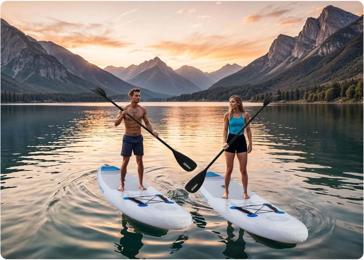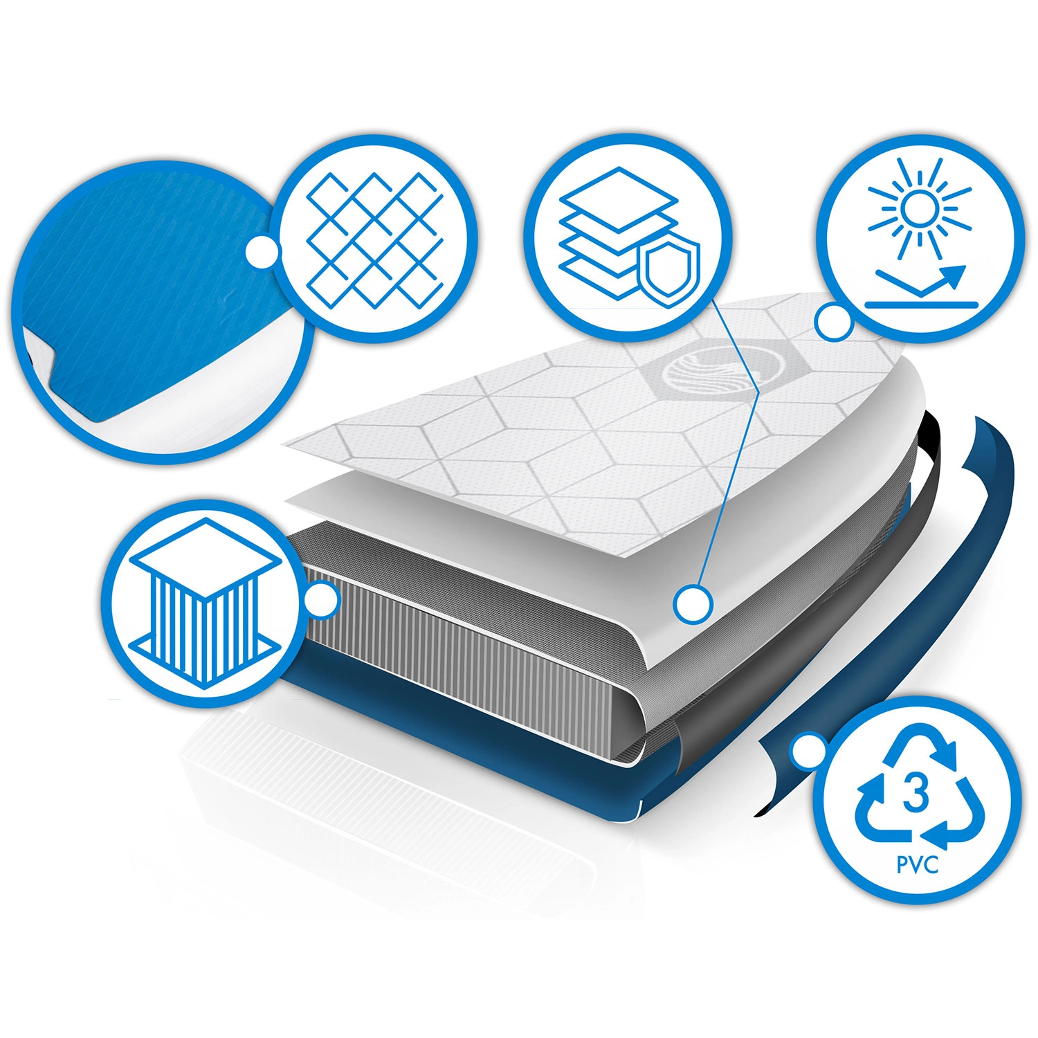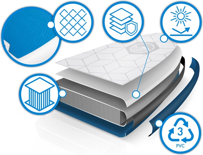 Večslojni PVC, gosto Drop Stitch vlakno in ojačani šivi zagotavljajo visoko togost, UV odpornost in dolgo življenjsko dobo. Nedrseča EVA podloga za zanesčen oprijem.