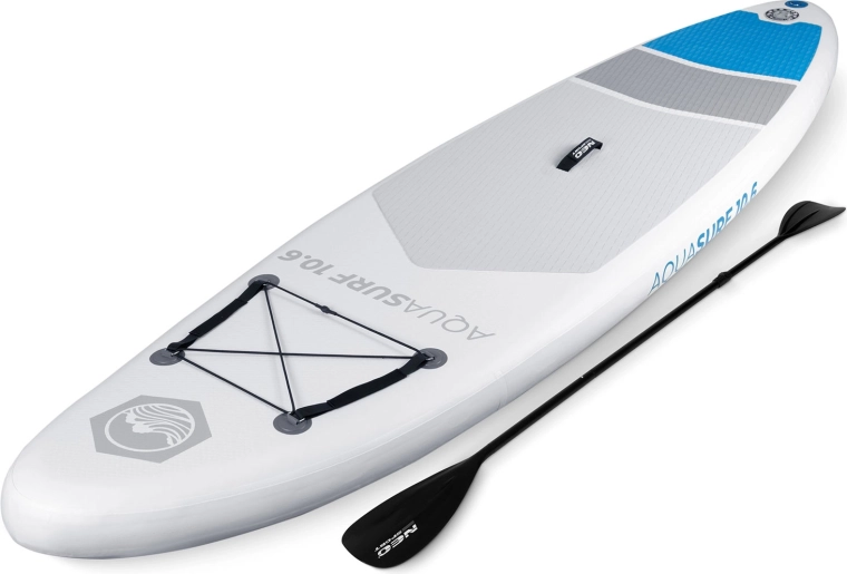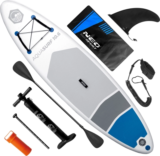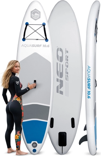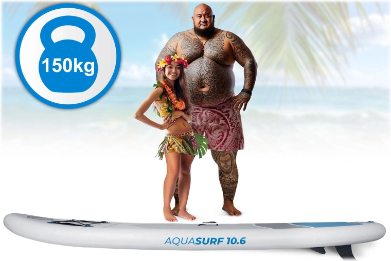 AQUASURF 10'6 je vsestranski napihljiv SUP za rekreativno veslanje, fitnes in izlete po jezerih ter mirnih rekah. Zaradi širine 84 cm ponuja odlično stabilnost, prostornina 318 l nosi uporabnika do 150 kg, nedrseča EVA podloga pa doda zanesljivost pri vsakem koraku. Trije udobni ročaji olajšajo upravljanje na obali in na vodi.