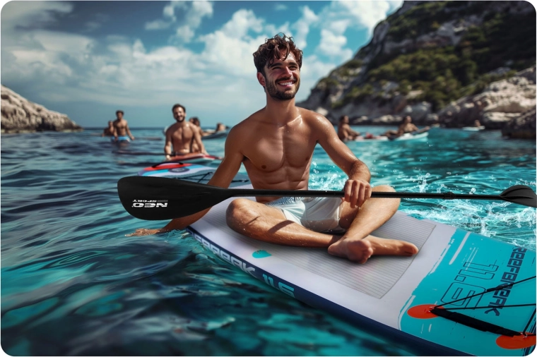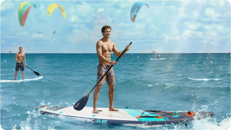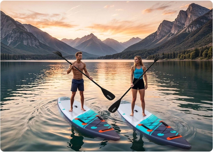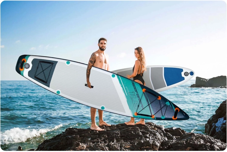 Konstrukcija Drop Stitch Light s troslojnim PVC, ogljikovo ojačitvijo roba in okrepljenimi šivi združuje nizko težo (pribl. 14 kg) z visoko togostjo in odpornostjo proti UV. Protizdrsna EVA je prijetna za boso stopalo, ne drsi in blaži udarce. Sprednja elastična cargo vrvica varno drži nahrbtnik ali brisačo, tesnilni ventil zanesljivo ohranja tlak, priložen je tudi ključ za razzračevanje.