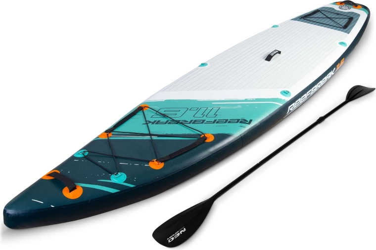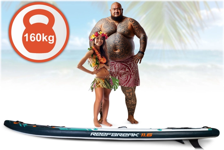 Reefbreak 350 × 81 × 15 cm je vrhunski all‑round SUP za mirno vodo in manjše valove. Zaradi širine 81 cm nudi odlično stabilnost za začetnike, dolžina 350 cm pa pomaga k boljšemu drsu in smerni stabilnosti na daljših vožnjah. Maksimalna nosilnost 160 kg in prostornina 332 l omogočata udoben prevoz opreme ali sopotnika. Pet praktičnih transportnih ročajev olajša rokovanje na bregu in v vodi.