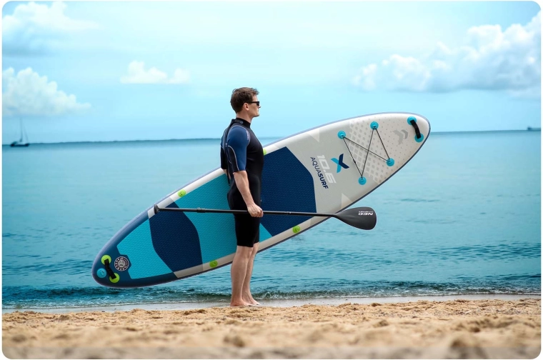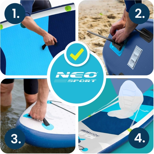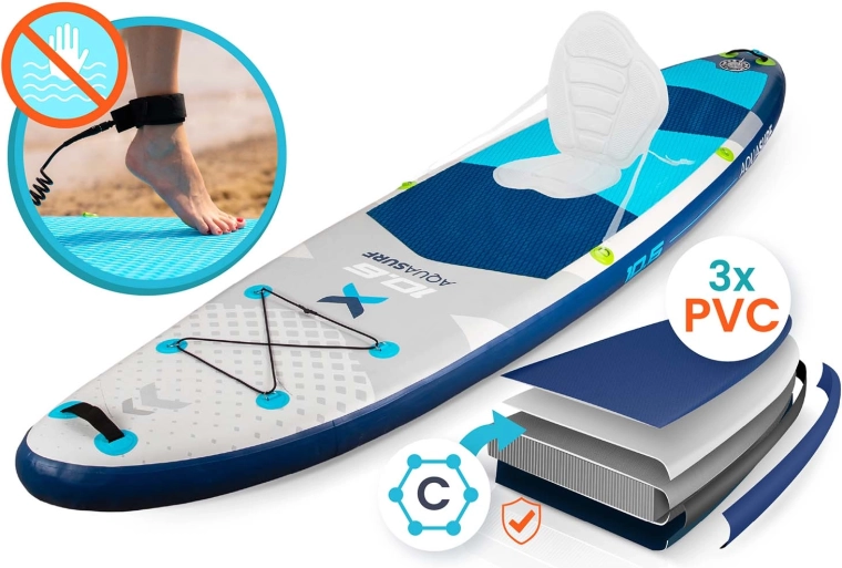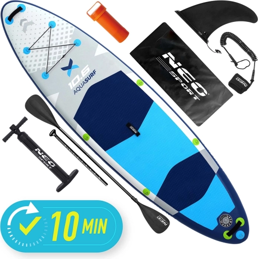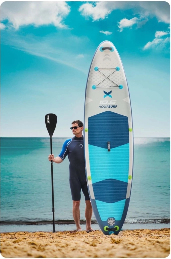 Uživajte v poletju z napenljivim SUP-om AQUASURF 10’6 – stabilna, odporna in lahka deska za mirne vode in manjše valove. V kompletu je vse za takojšen odhod na vodo: nastavljivo aluminijasto veslo, dvojdelna (dvofazna) tlačilka z manometrom, varnostna vrvica (leash), odstranljiv smernik, komplet za popravilo in transportni nahrbtnik. Protizdrsna EVA podloga, sprednji bungee sistem za opremo ter konstrukcija iz 3-slojnega PVC Drop Stitch Light zagotavljajo zanesčen korak, lahko manevriranje in dolgo življenjsko dobo.