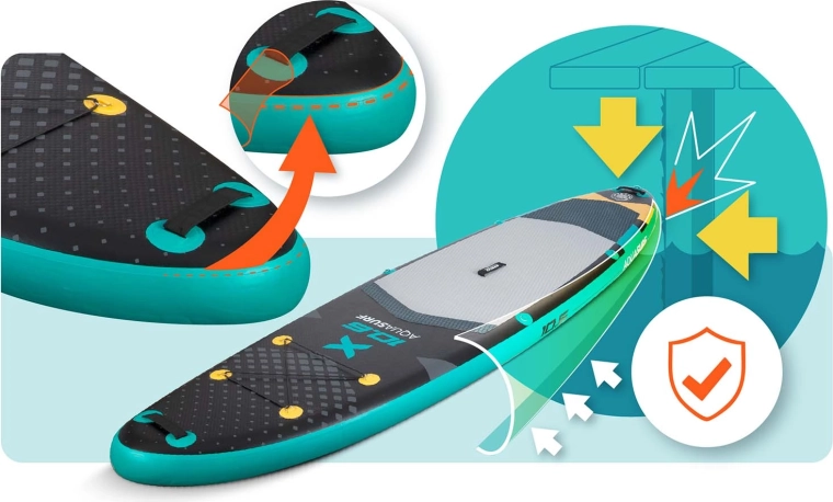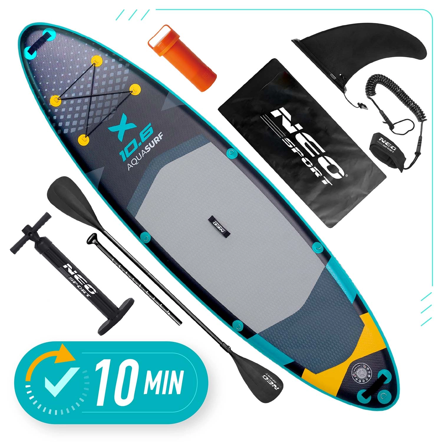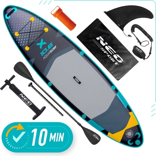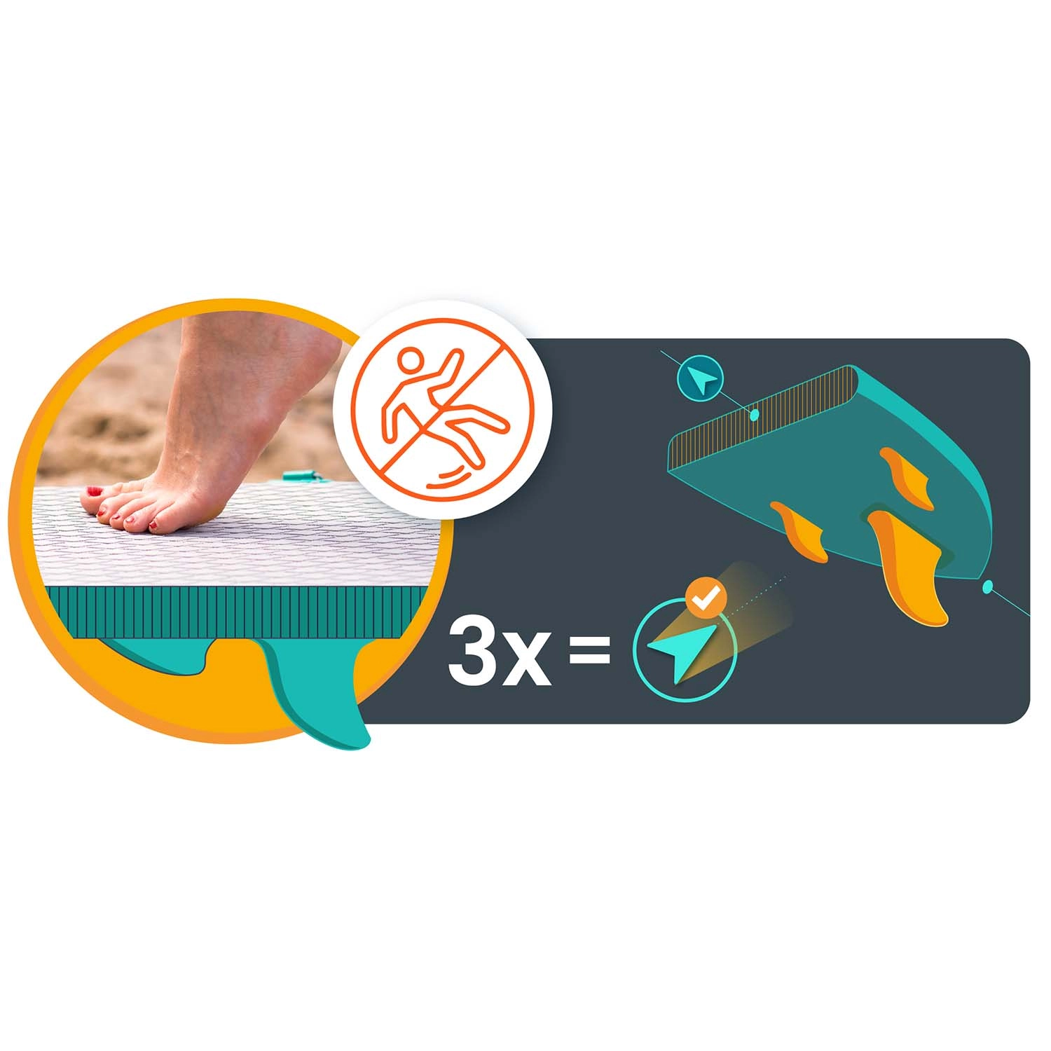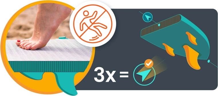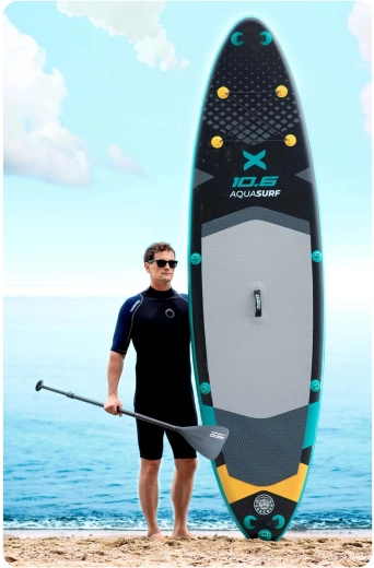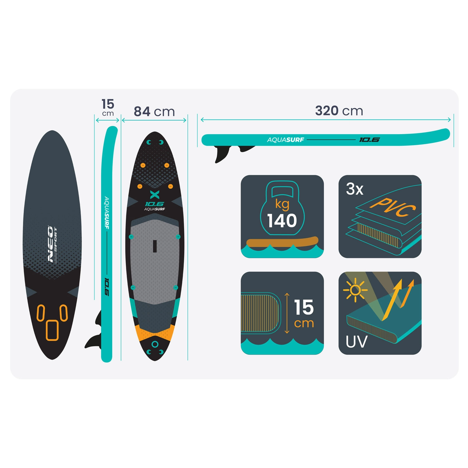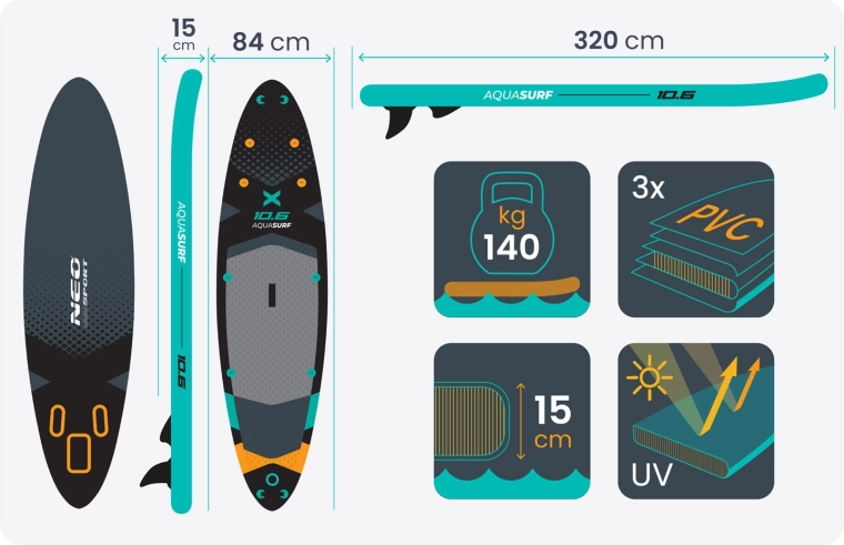 SUP Aquasurf 10’6 je zasnovan za zanesljiv korak in udobje na vsakem izletu. Široko stojišče, debelina 15 cm in tri stabilizacijske smernike zagotavljajo mirno plovbo in enostavno manevriranje. Nedrseča EVA podlaga drži tudi z mokrimi stopali, integrirane bungee vrvice na palubi pa varno pritrdijo nahrbtnik, steklenico ali jakno.