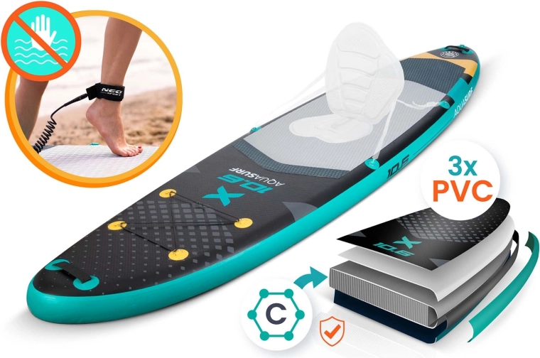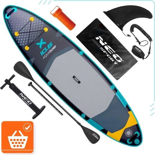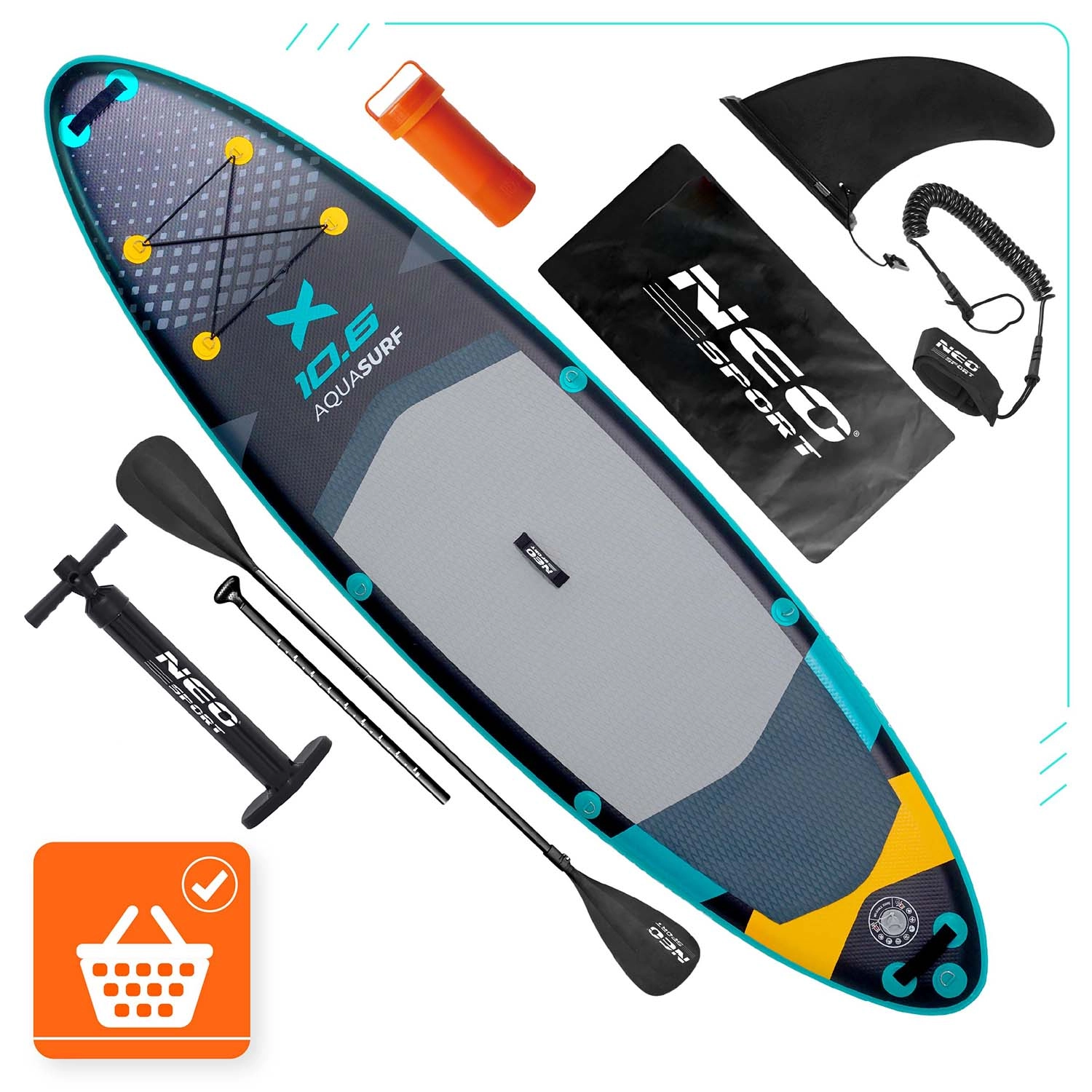 V paketu dobite vse, kar potrebujete: nastavljivo aluminijasto veslo (162–210 cm), dvosmerno pumpo z manometrom, varnostni leash, odstranljiv smernik, komplet za popravilo in trpežen transportni nahrbtnik. Trislojna PVC konstrukcija s tehnologijo Drop Stitch Light, UV-odporna površina in ojačani robovi zagotavljajo dolgo življenjsko dobo – za začetnike in za tiste, ki želijo nadgraditi svojo tehniko.