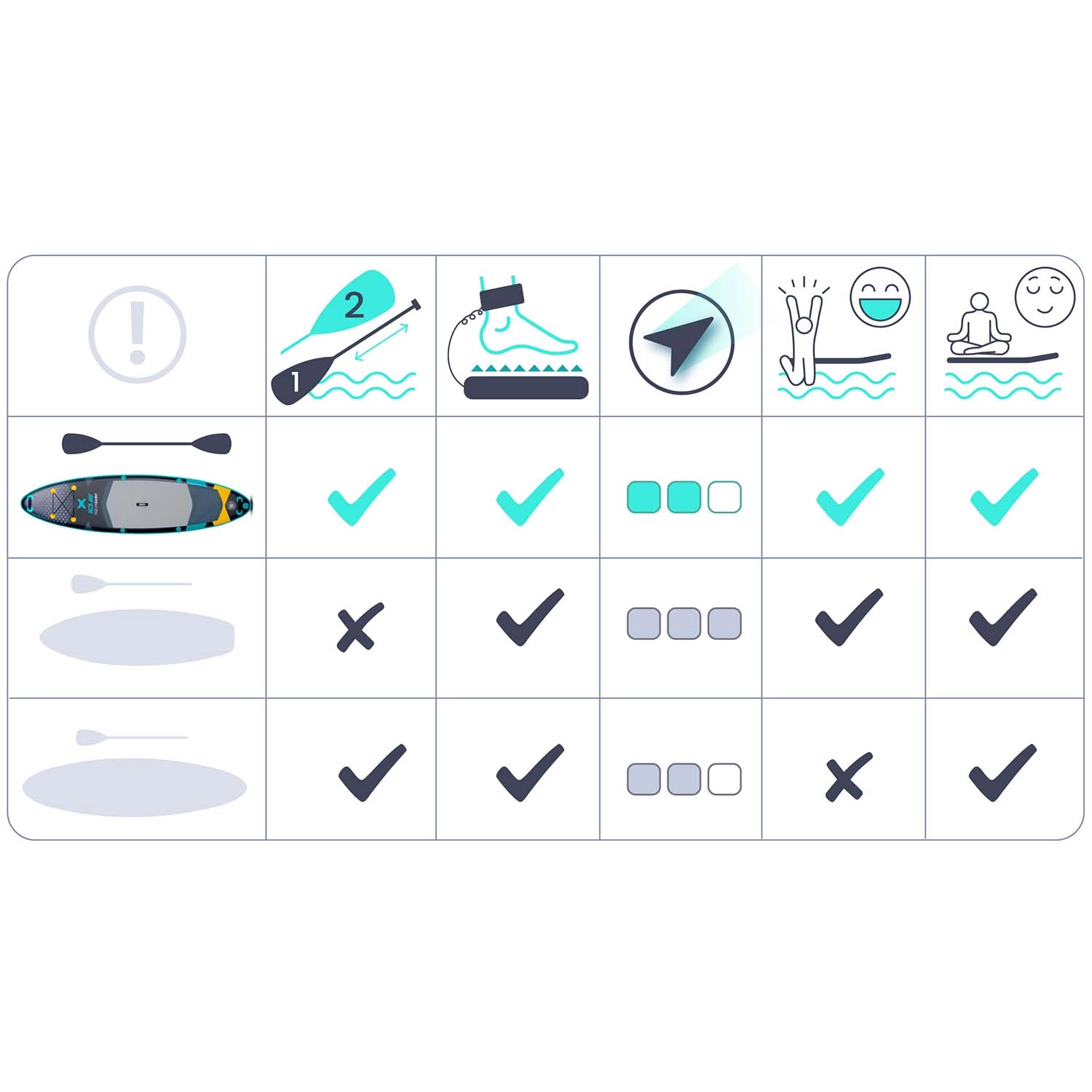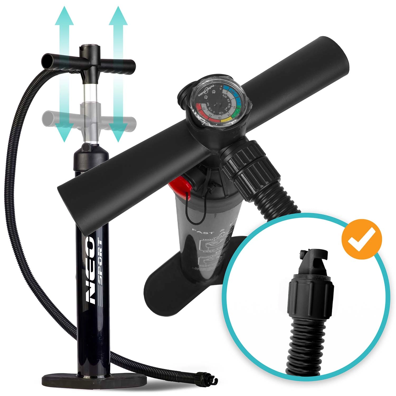 Popoln set omogoča, da odrinete takoj. Nastavljivo aluminijasto veslo 162–210 cm, dvosmerna pumpa z manometrom, varnostna povodčna vrvica za nogo in trpežen transportni nahrbtnik.