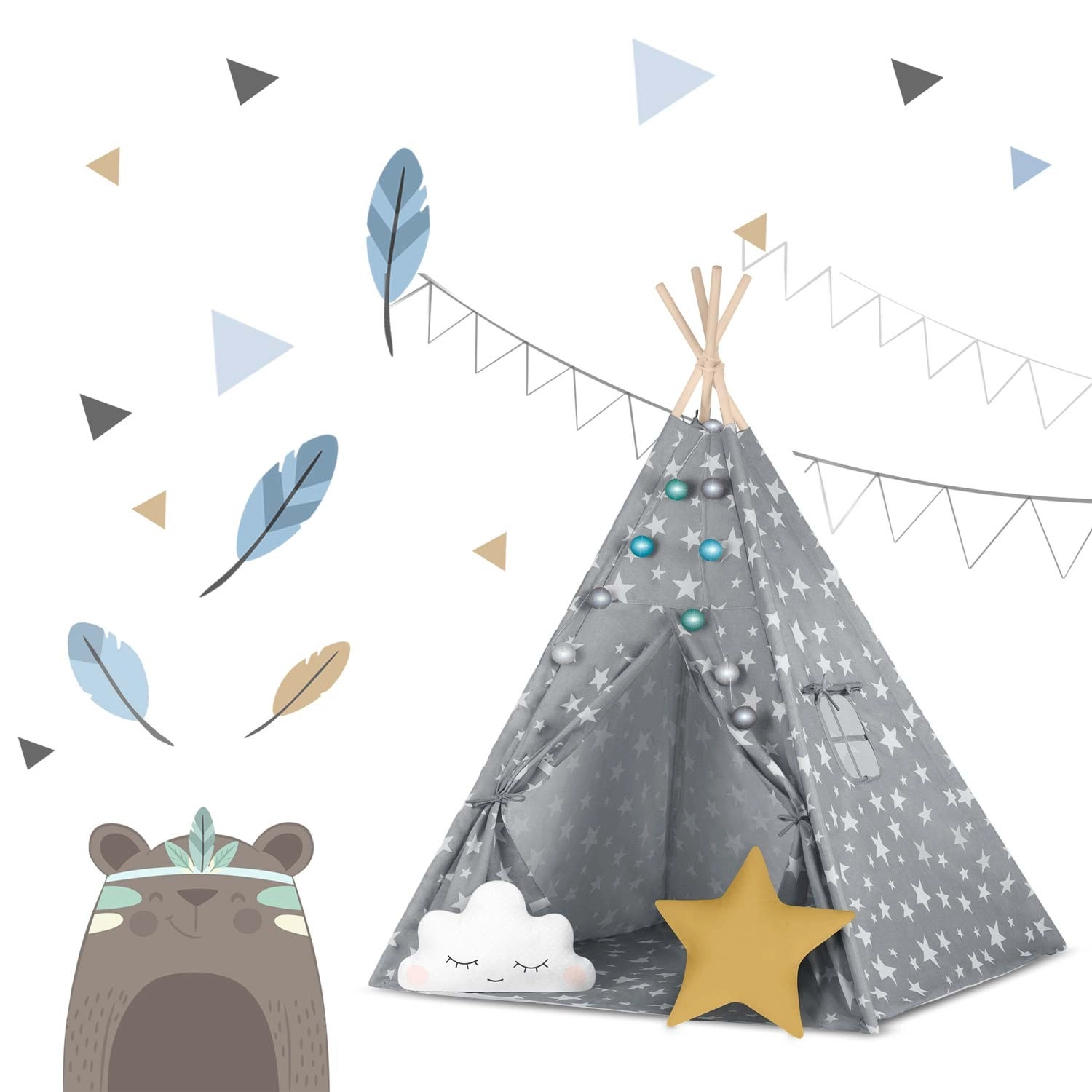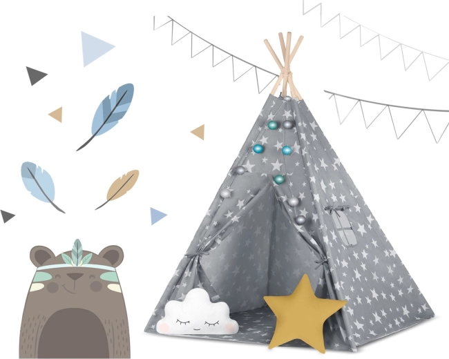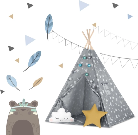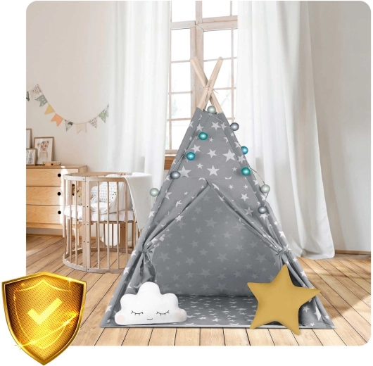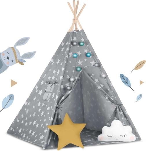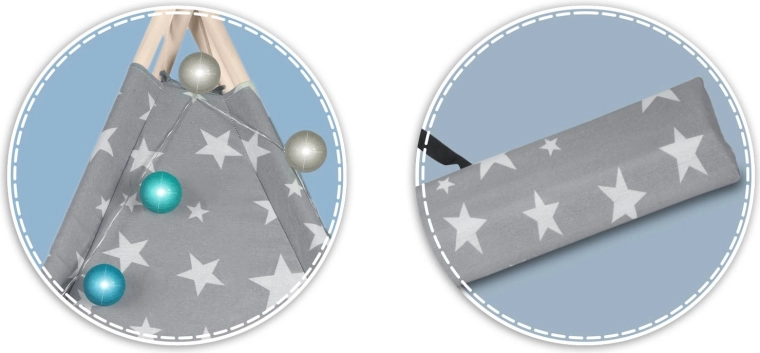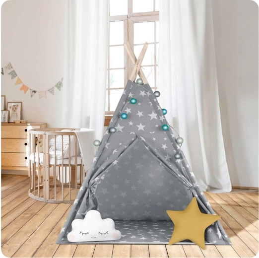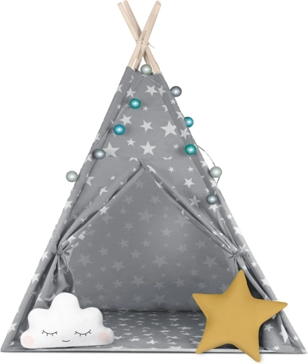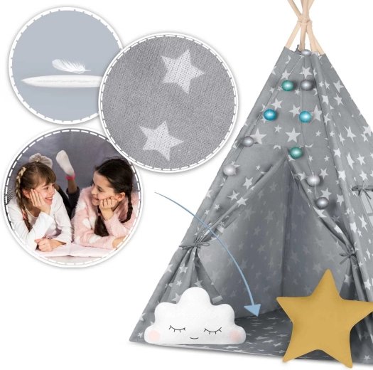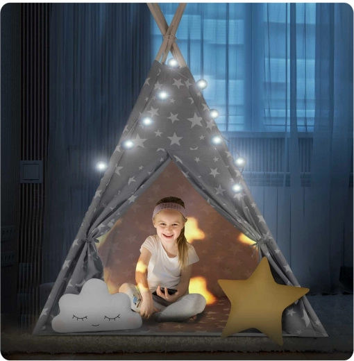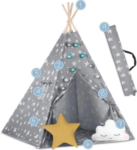V paketu je vse, kar potrebujete: 4 borove palice, stabilizator za dodatno trdnost, LED lučke (na baterije), všita podloga, 2 mehki blazinici v obliki oblačka in zvezde, okence z rolo zaveso ter praktičen prenosni etui. Tipi preprosto zložite in prenesete – popoln za otroško sobo, igralni kotiček ali za senco na vrtu.
