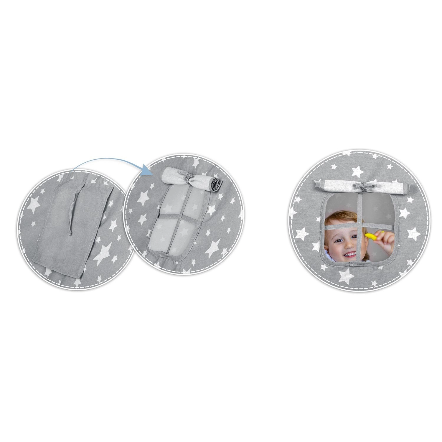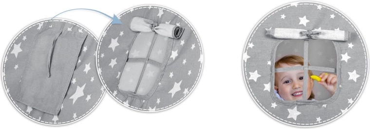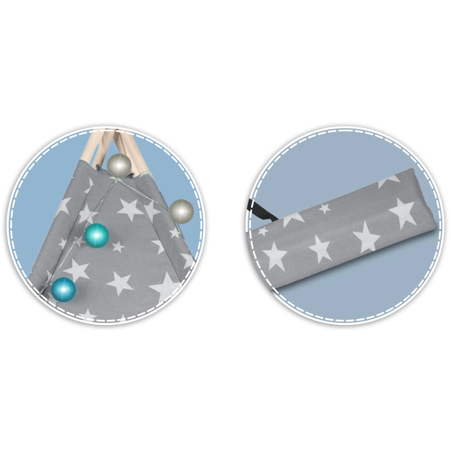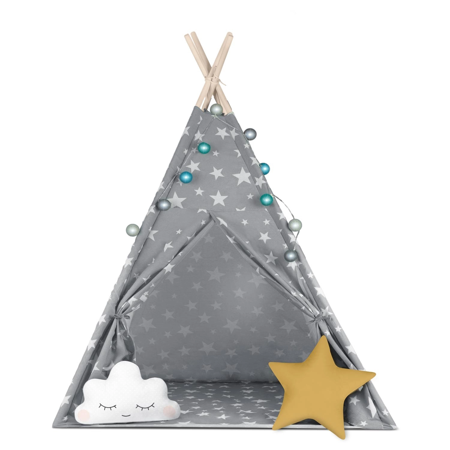 V paketu je vse, kar potrebujete: 4 borove palice, stabilizator za dodatno trdnost, LED lučke (na baterije), všita podloga, 2 mehki blazinici v obliki oblačka in zvezde, okence z rolo zaveso ter praktičen prenosni etui. Tipi preprosto zložite in prenesete – popoln za otroško sobo, igralni kotiček ali za senco na vrtu.