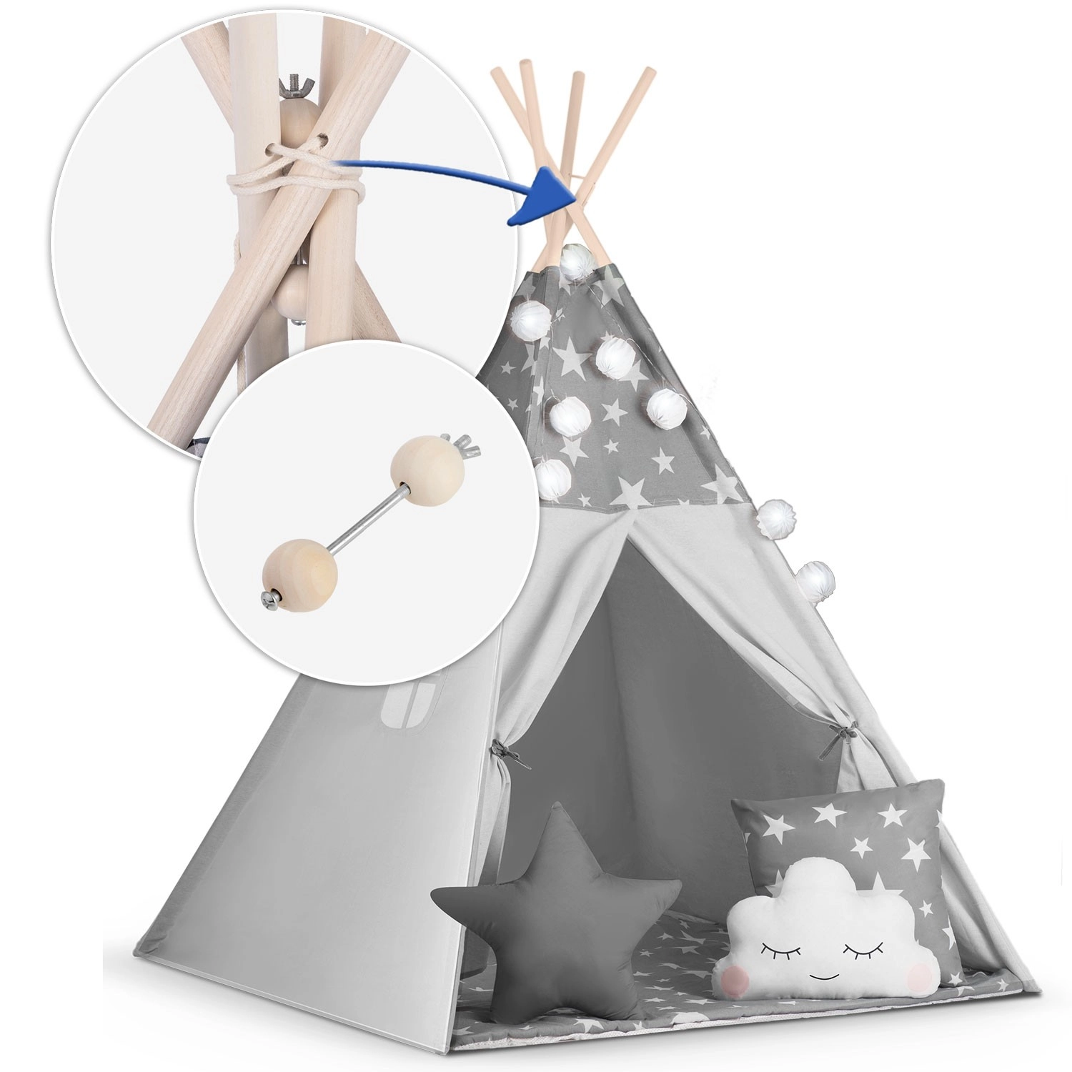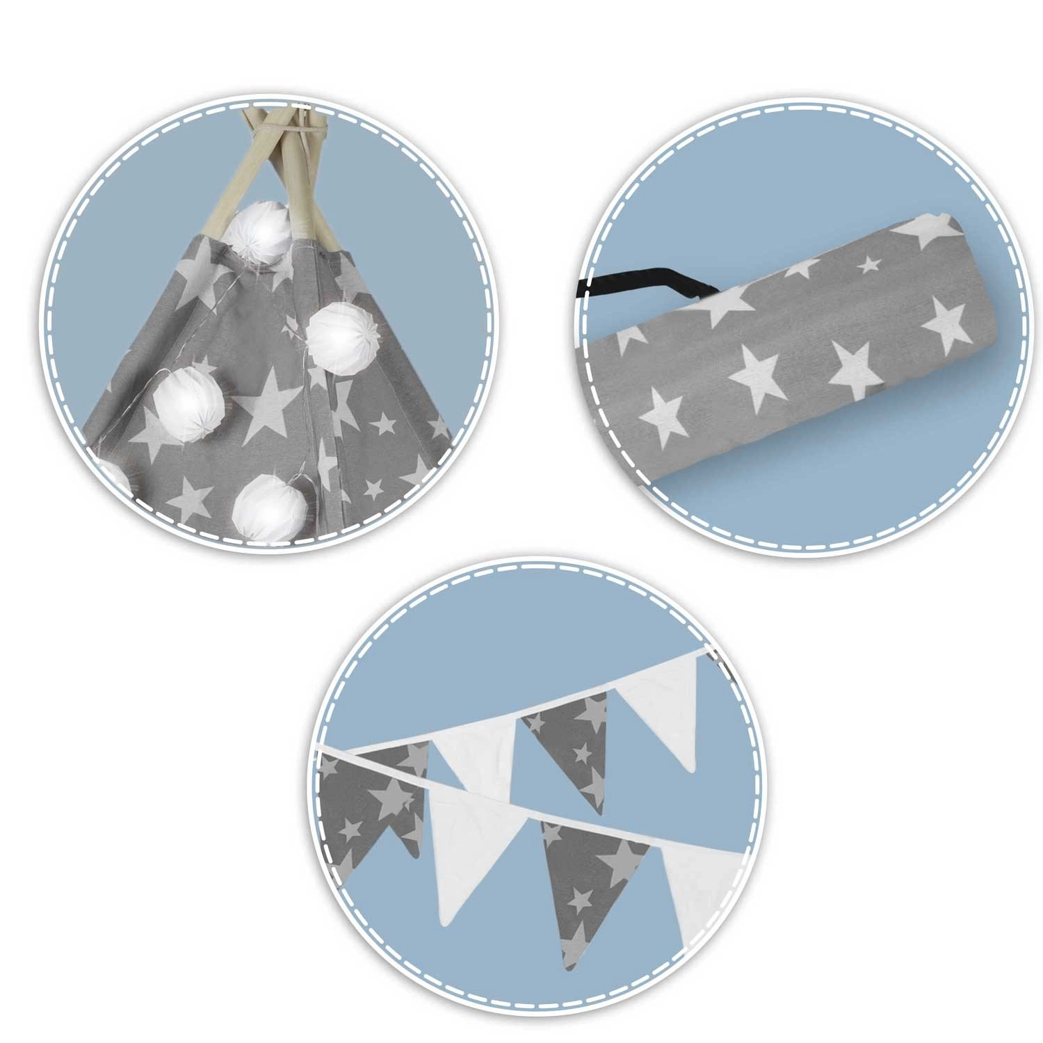 Ustvarite otrokom njihov prijeten kotiček s teepee šotorom NUKIDO. Ta stilski šotor v nežni sivi barvi z zvezdicami je sešit iz premijskega bombaža, ima stabilno leseno konstrukcijo s stabilizatorjem gratis in vključuje mehko izolacijsko podlogo, 3 blazinice, girlando, lučke in transportno torbo. Preprosto se zloži, odlično zrači in je idealen za igro, branje ter počitek doma ali na vrtu.