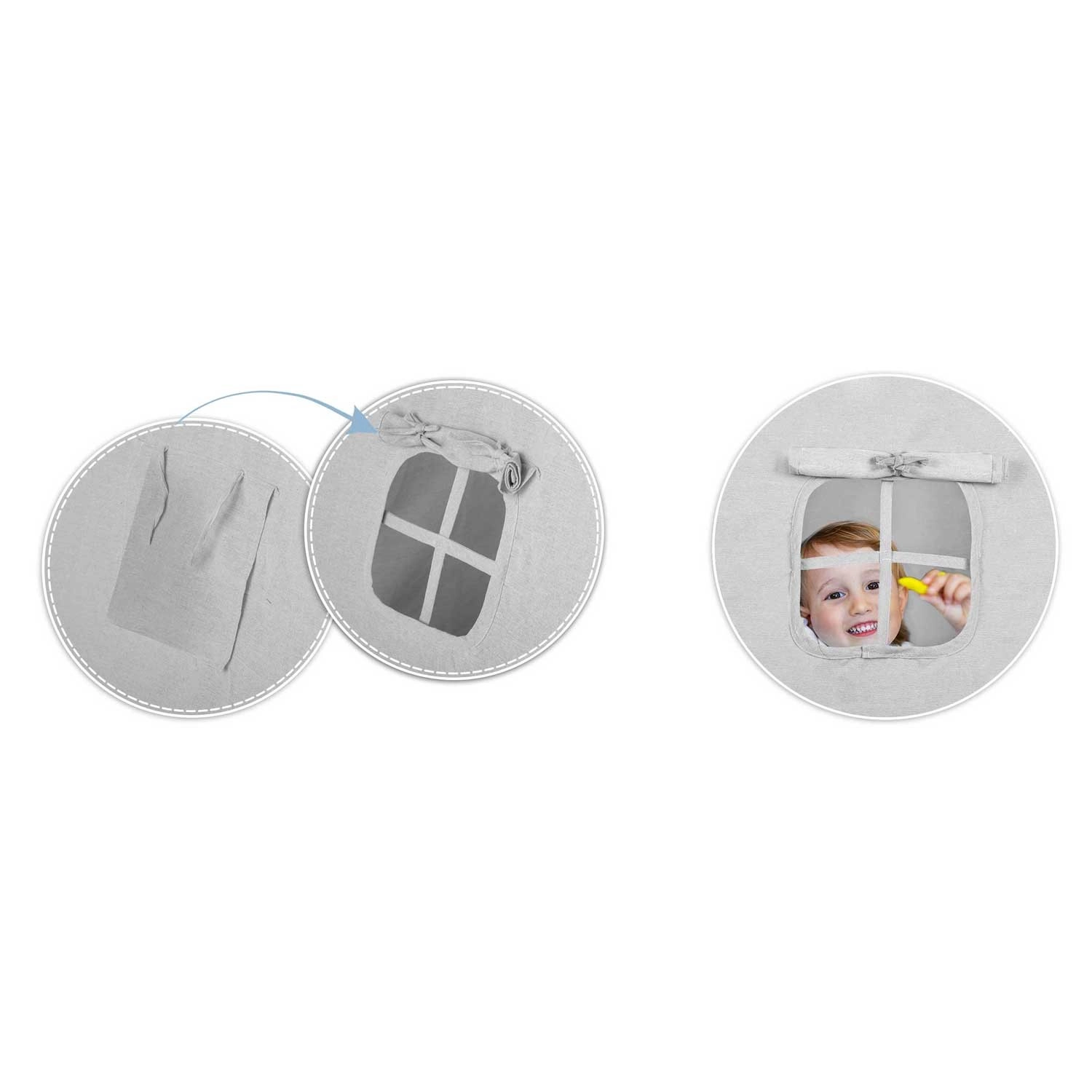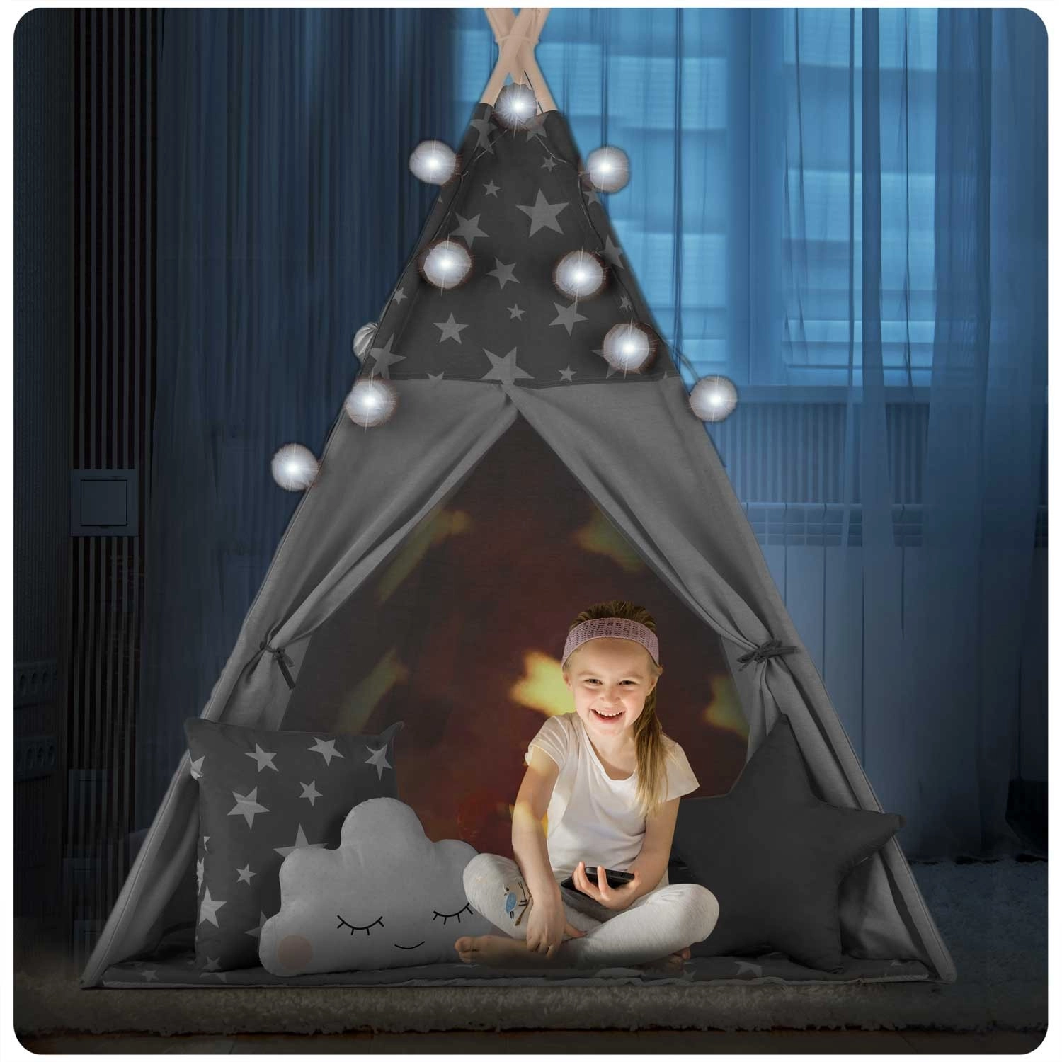 Za maksimalno udobje je v paketu oblazinjena izolacijska podloga s protidrsno obdelavo in tri dekorativne blazinice. Za vzdušje poskrbijo LED lučke in girlanda, medtem ko zvite okence in zavezljiva vhoda očarata s prostorom in svetlobo. Po zlaganju teepee zavzame minimalno prostora, v priloženi torbi pa ga zlahka prenesete.