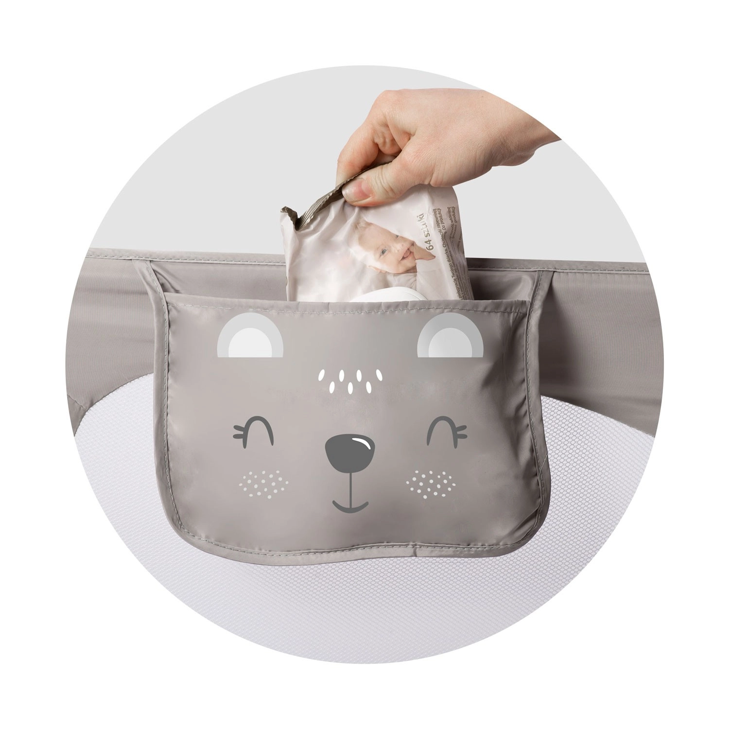 Namestitev je hitra – ograjo lahko privijete na okvir postelje ali jo pritrdite s trakovi SafetyBelt (možna je kombinacija za večjo stabilnost). Priročni žep ohranja pri roki dudico, igračko ali druge drobnarije. Funkcija zlaganja do 180° omogoča lahek dostop do otroka brez demontaže.