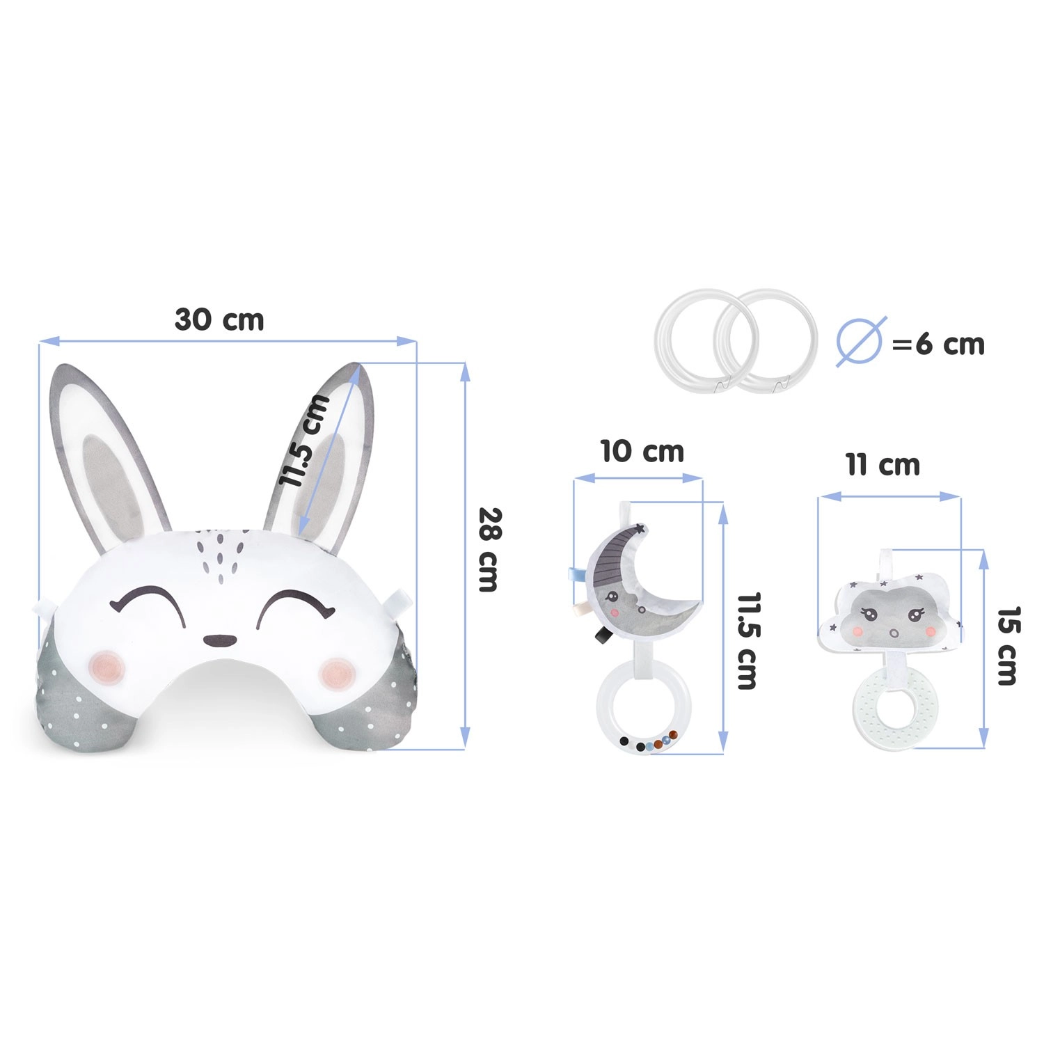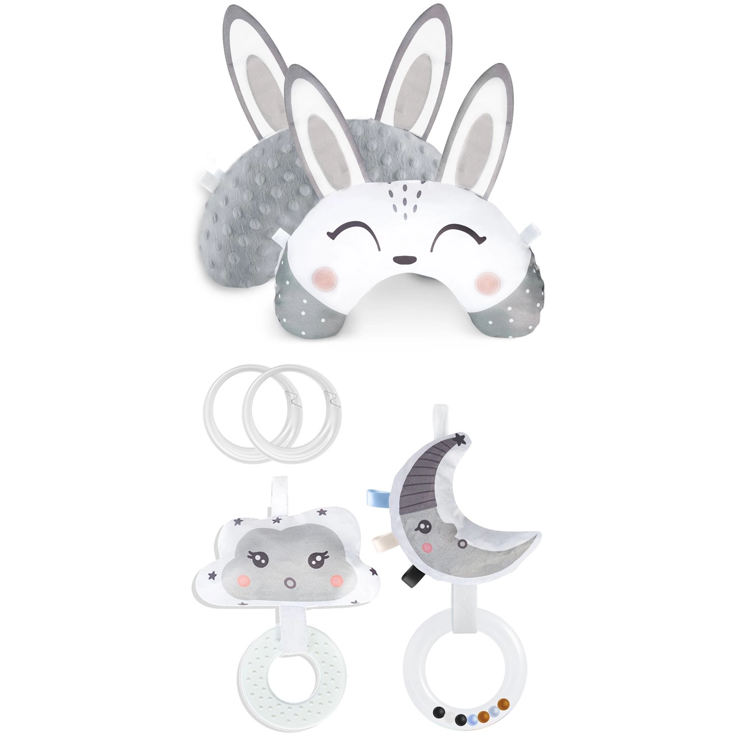 Šumeči oblaček z grizalom in lunin krajec z ropotuljico spodbujata sluh, otip in vid. Plastični obročki omogočajo enostavno pripenjanje in menjavo igrač po potrebi.
