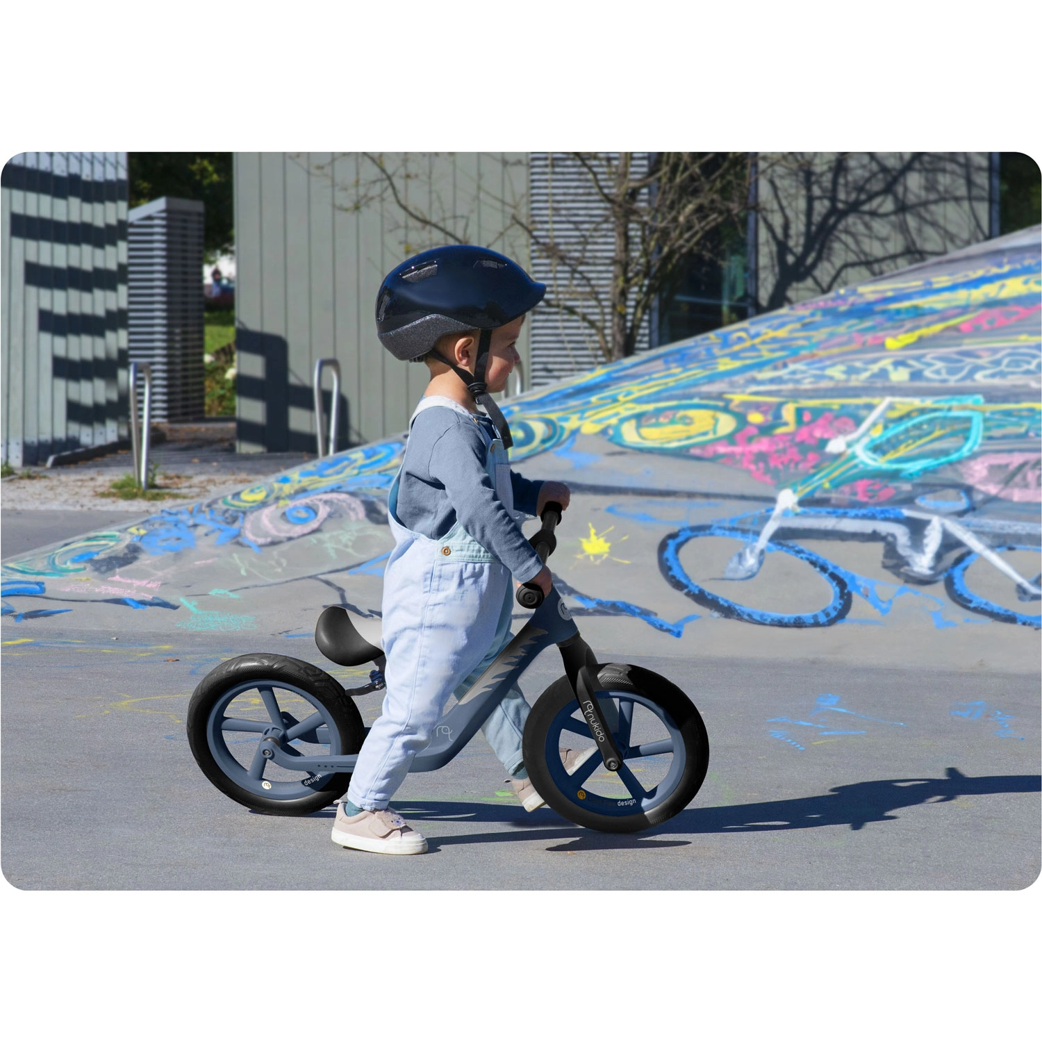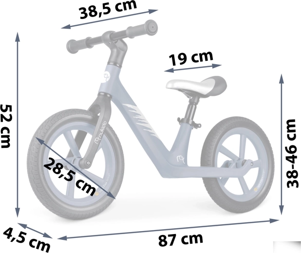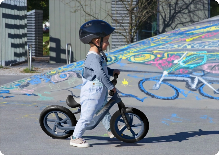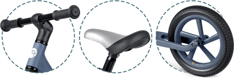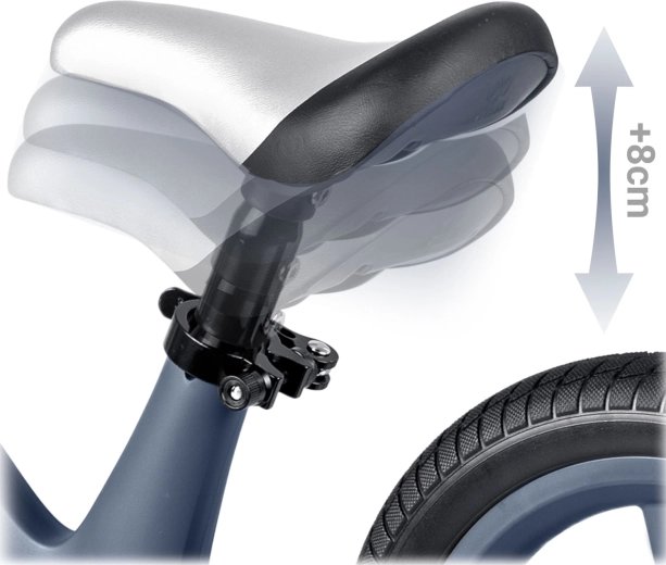 Z tekoče nastavljivo višino sedeža (pribl. 35–41 cm) poganjalec raste skupaj z otrokom in zagotavlja idealen položaj v vsaki razvojni fazi. Neprebojna 12" EVA kolesa blažijo neravnine in ne zahtevajo vzdrževanja, gumijasti ročaji z odbojniki ščitijo otroške roke in prinašajo zanesljivost pri vodenju.