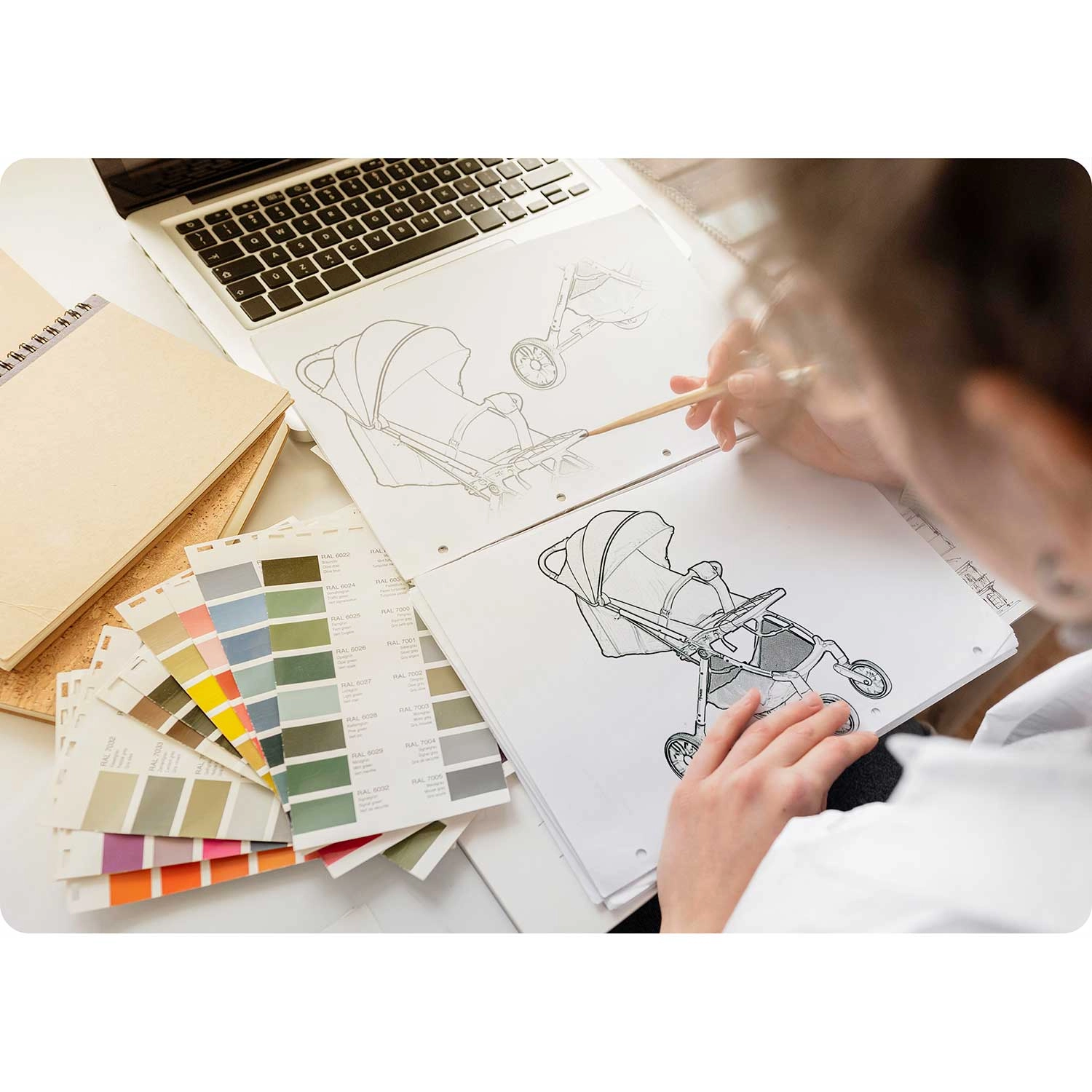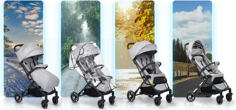 Praktična oprema vključuje prostoren koš pod sedežem, odstranljiv varnostni lok za lažje posedanje otroka, dežno prevleko in zimsko pokrivalo v kompletu ter varne, mehke tkanine prijetne na dotik. Velika strehica z možnostjo razširitve ščiti pred soncem, vetrom in rahlim dežjem ter se prilagodi temu, ali otrok spi ali opazuje svet okoli sebe.