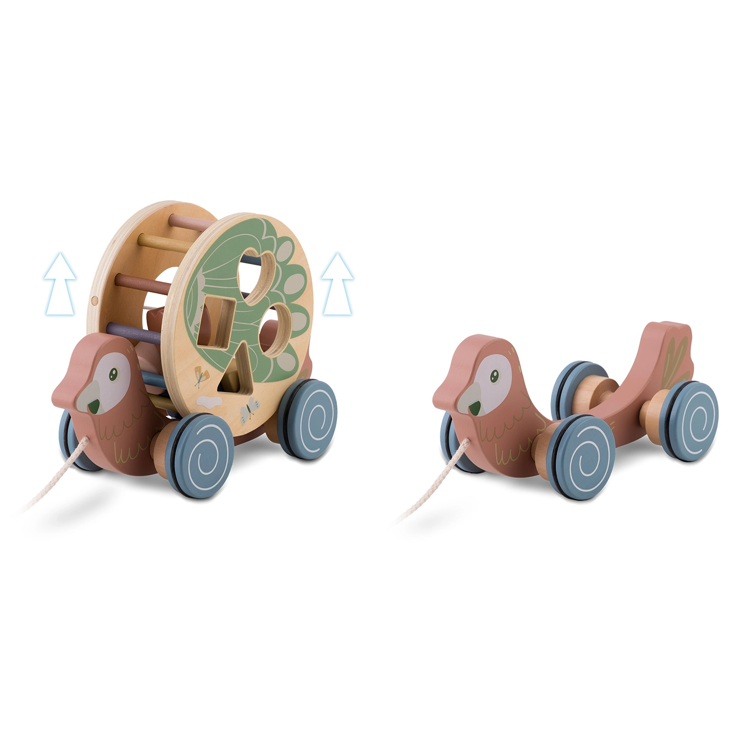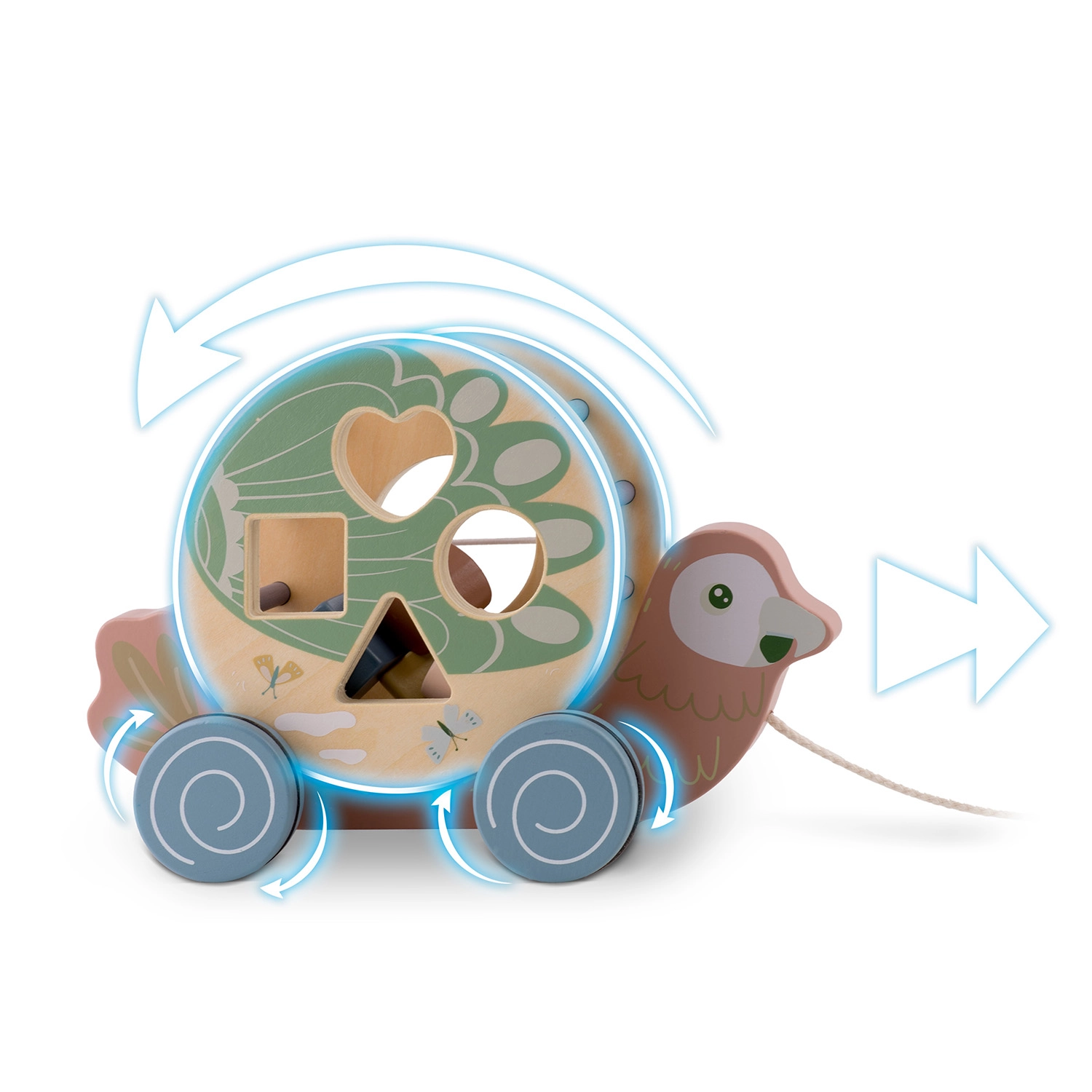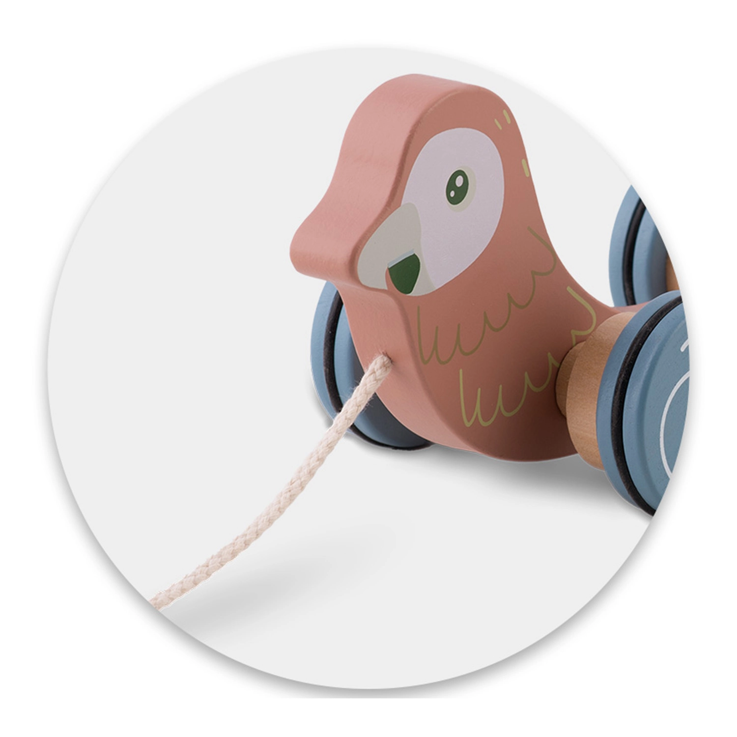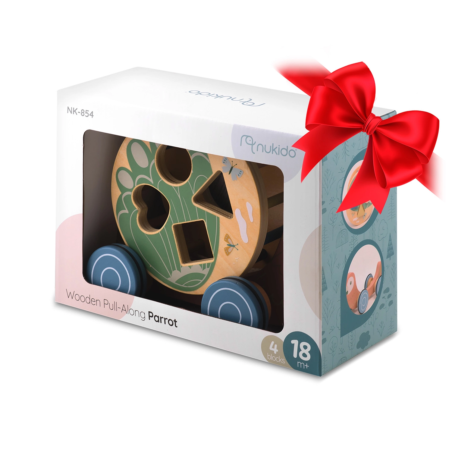 Leseni papagaj znamke NUKIDO združuje dve priljubljeni dejavnosti v eni igrački: vlečno žival na kolescih in vrtečo se sortirko oblik. Med gibanjem se boben z izrezi (srce, kvadrat, krog, trikotnik) vrti, kar otroke spodbuja k raziskovanju odnosa vzrok–posledica in k veslemu gibanju. Pastelne barve, gladki robovi in trdna lesena konstrukcija zagotavljajo varno in dolgotrajno zabavo.